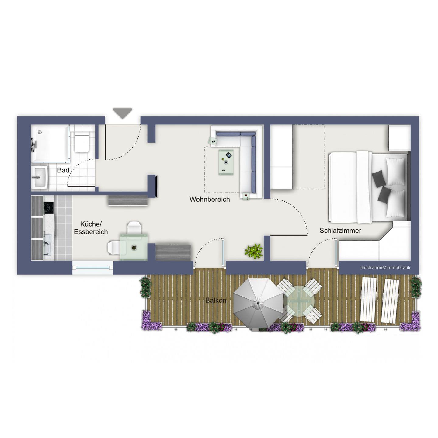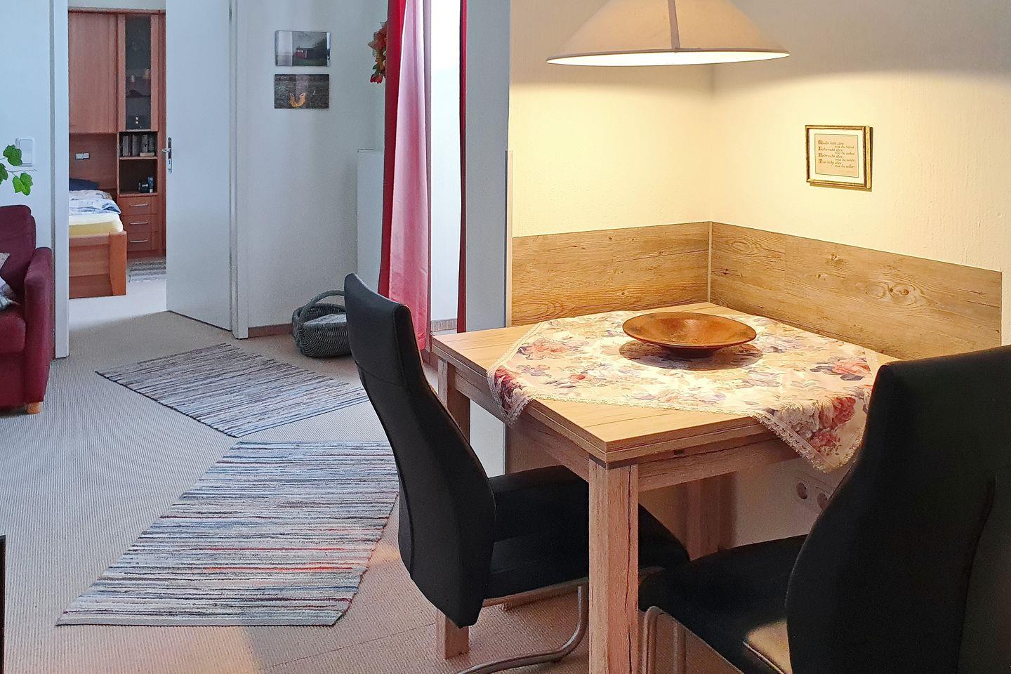 Der Wohnbereich bietet dir eine große Multiflexx-Schlafcouch (2,20 x 2,10 m). Für Unterhaltung am Abend sorgen dann der Flachbild-TV und das Radio. Außerdem hast du vom Wohnzimmer der Ferienwohnung einen bequemen Zugang zum schönen Balkon. Entspanne an der frischen Luft.