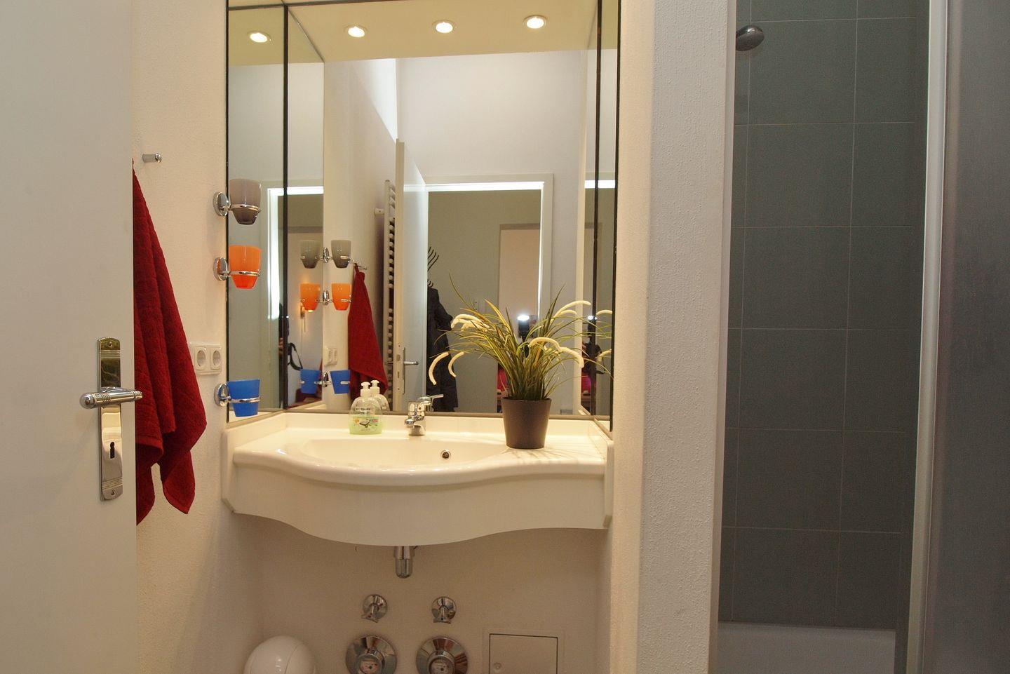Selbstverständlich gibt es auch ein Badezimmer. Im innenliegenden Duschbad erwarten dich ein WC, ein Waschbecken, ein Spiegel und ein Föhn. Als Bodenbelag wurde in der ganzen Wohnung Teppich verwendet. Ausnahme sind die Nassbereiche, welche über Fliesen verfügen.
