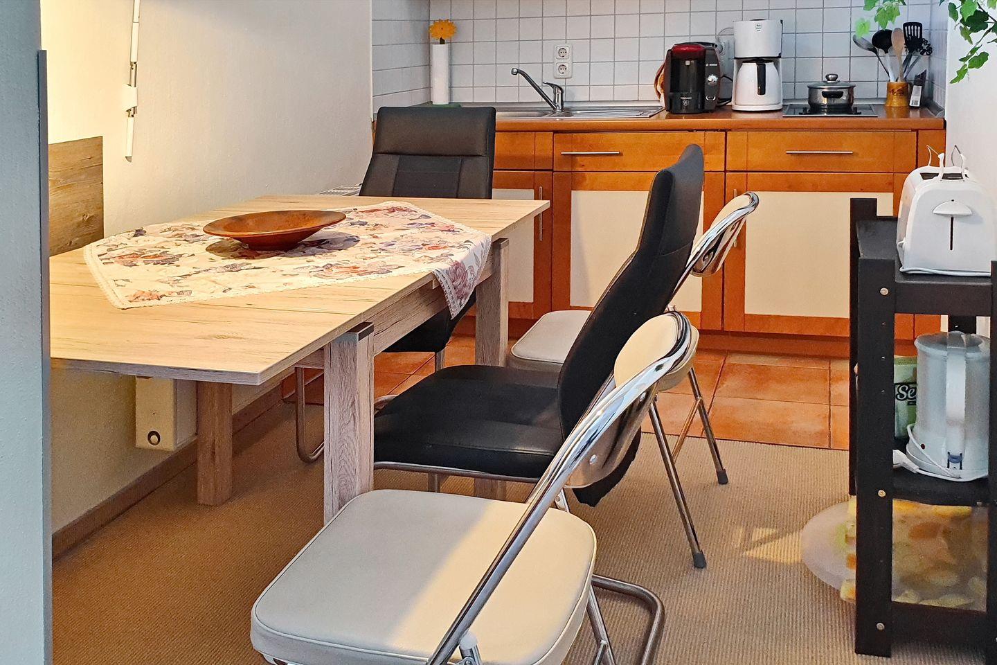 Die offene Küchenzeile bietet allerlei Zubehör für die Zubereitung von leckeren Speisen. Unter anderem kannst du hier ein 2-Platten-Cerankochfeld, eine Mikrowelle, einen Kühlschrank, eine Kaffeemaschine, einen Wasserkocher und einen Toaster finden. An dem ausziehbaren Esstisch finden bis zu 4 Personen Platz.