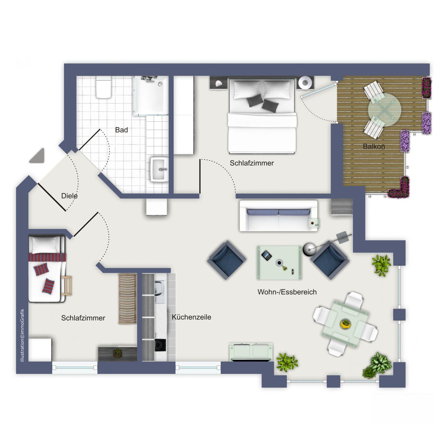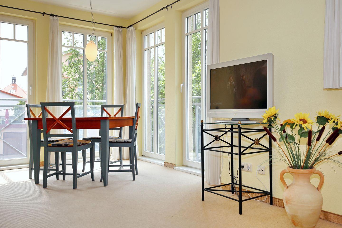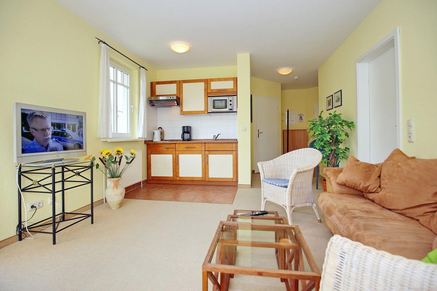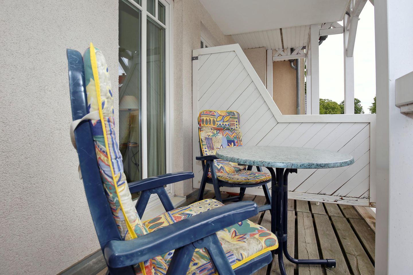 Der lichtdurchflutete Wohnbereich ist ausgestattet mit einer Couch und zwei Korbstühlen. Für Unterhaltung und Abwechslung sorgen am Abend der Flachbild-Fernseher oder die Stereoanlage. Der Balkon kann vom großen Schlafzimmer aus betreten werden. Auf dem kleinen Balkon zur Südseite kannst du die Sonnenstunden an der frischen Luft genießen.