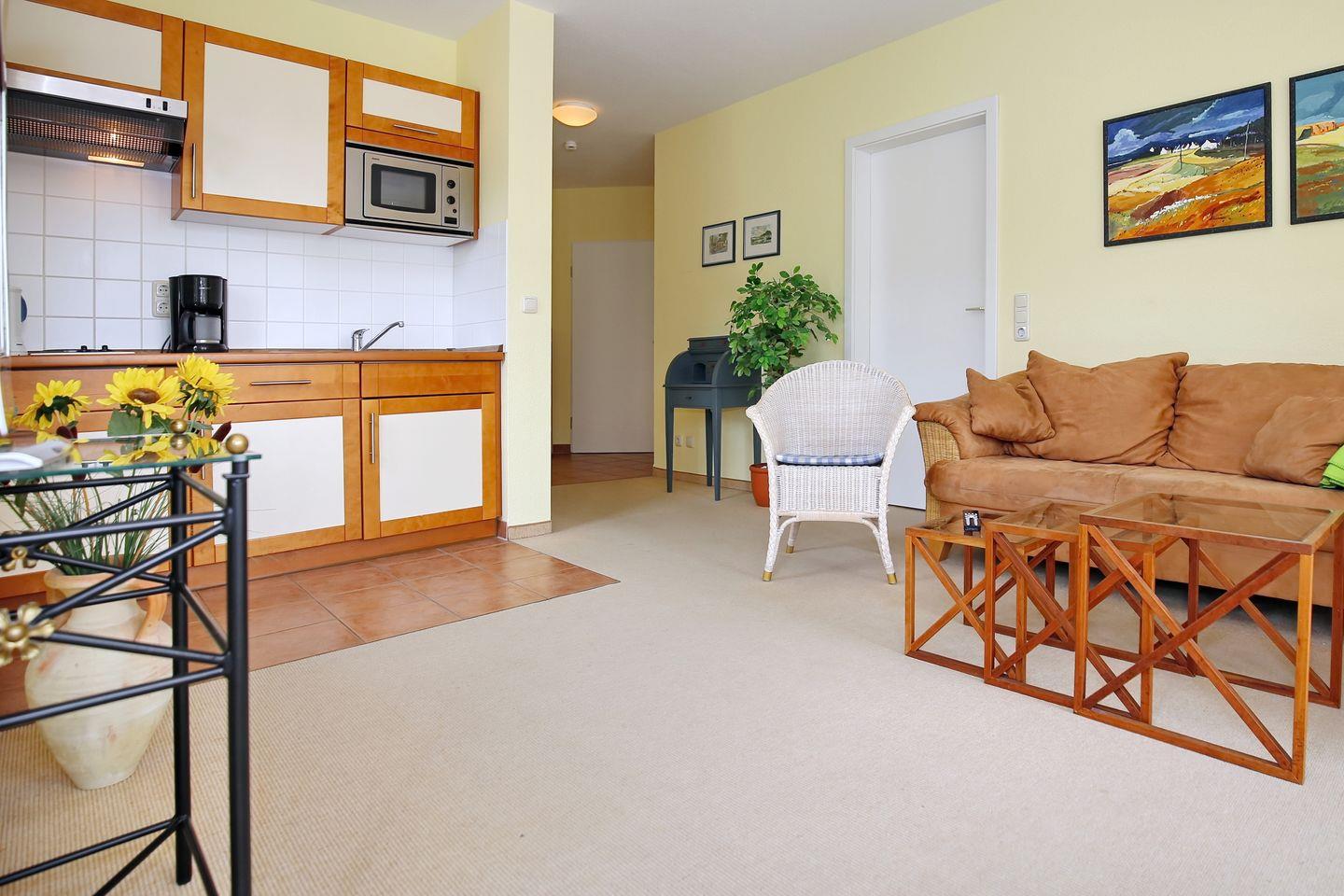 Im Wohnraum integriert ist außerdem die Küchenzeile. Bereite gemeinsam in der Ferienwohnung deine Mahlzeiten vor. Die Küche verfügt über ein 2-Platten-Cerankochfeld, eine Mikrowelle, einen Kühlschrank und selbstverständlich stehen hier auch eine Kaffeemaschine, ein Toaster und ein Wasserkocher bereit. Am Esstisch ist für 4 Personen Platz.