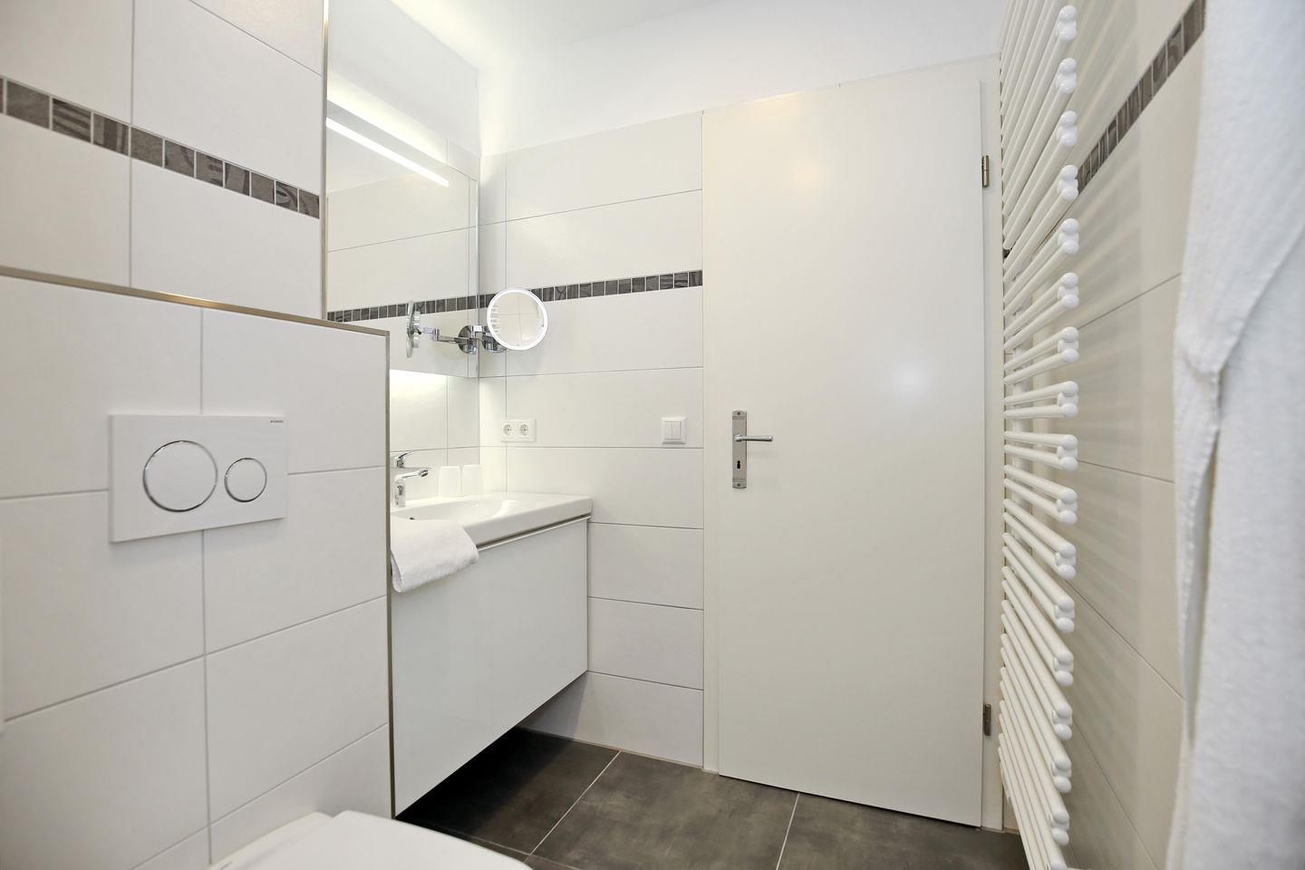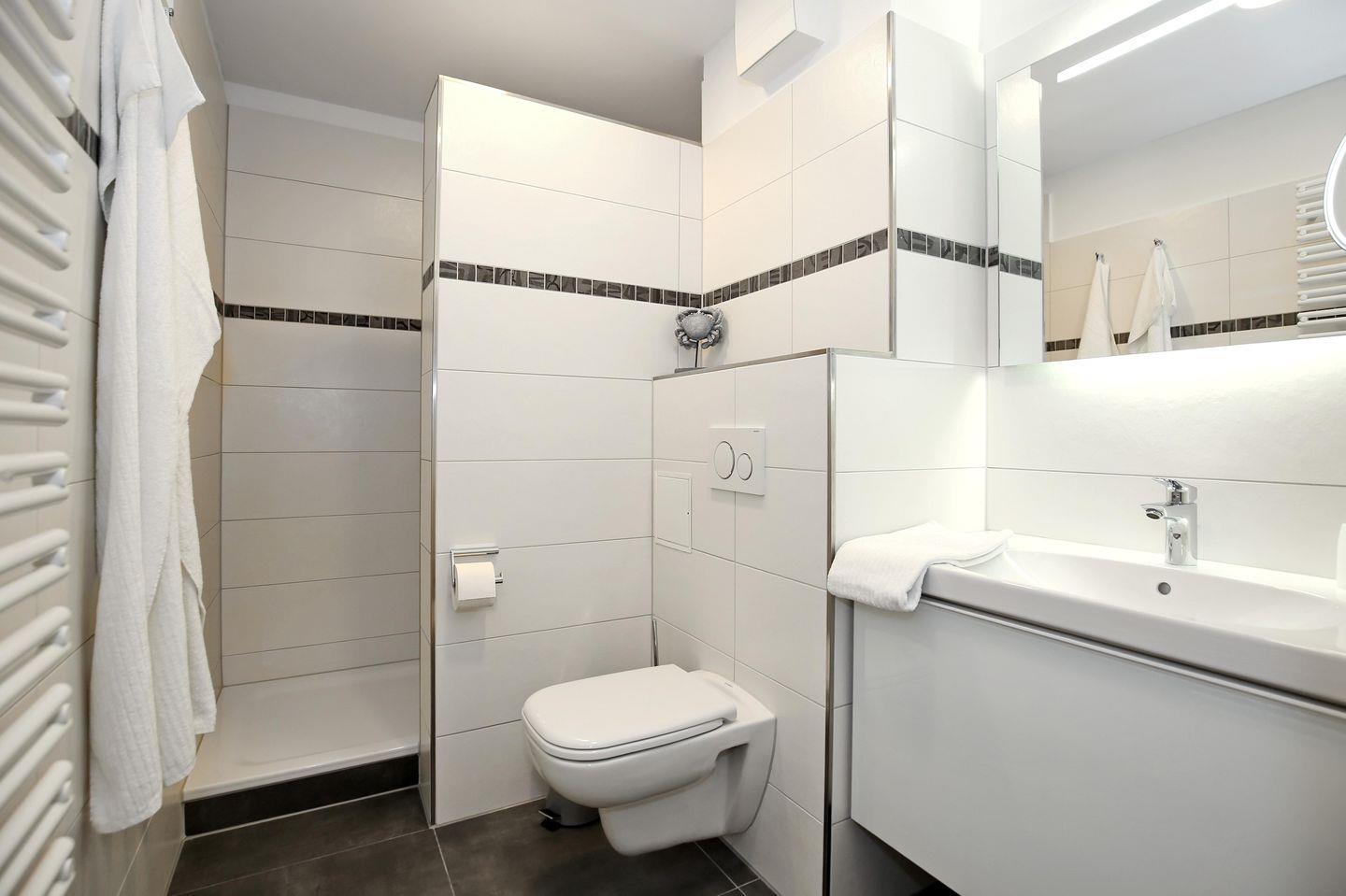 Die Ferienwohnung verfügt selbstverständlich auch über ein Duschbad/WC, einen Föhn und einen Kosmetikspiegel.