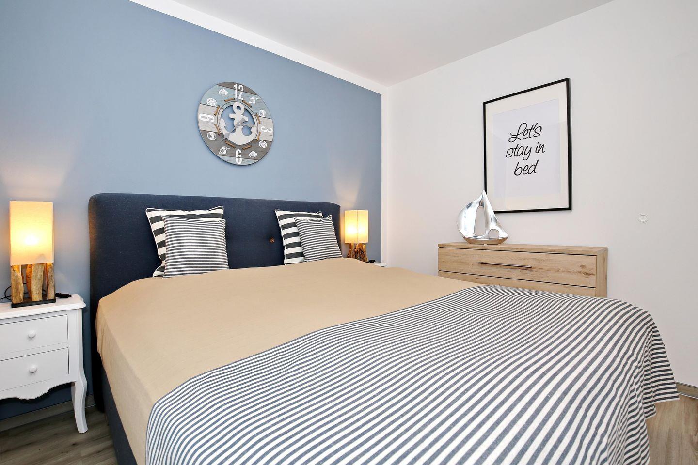 Im Schlafzimmer (das Schlafzimmerfenster geht zum Atrium raus) steht ein Boxspringbett (180 cm x 200 cm) und im Wohnzimmer eine Doppelschlafcouch (140 cm x 200 cm), sowie ein Flachbild-TV.