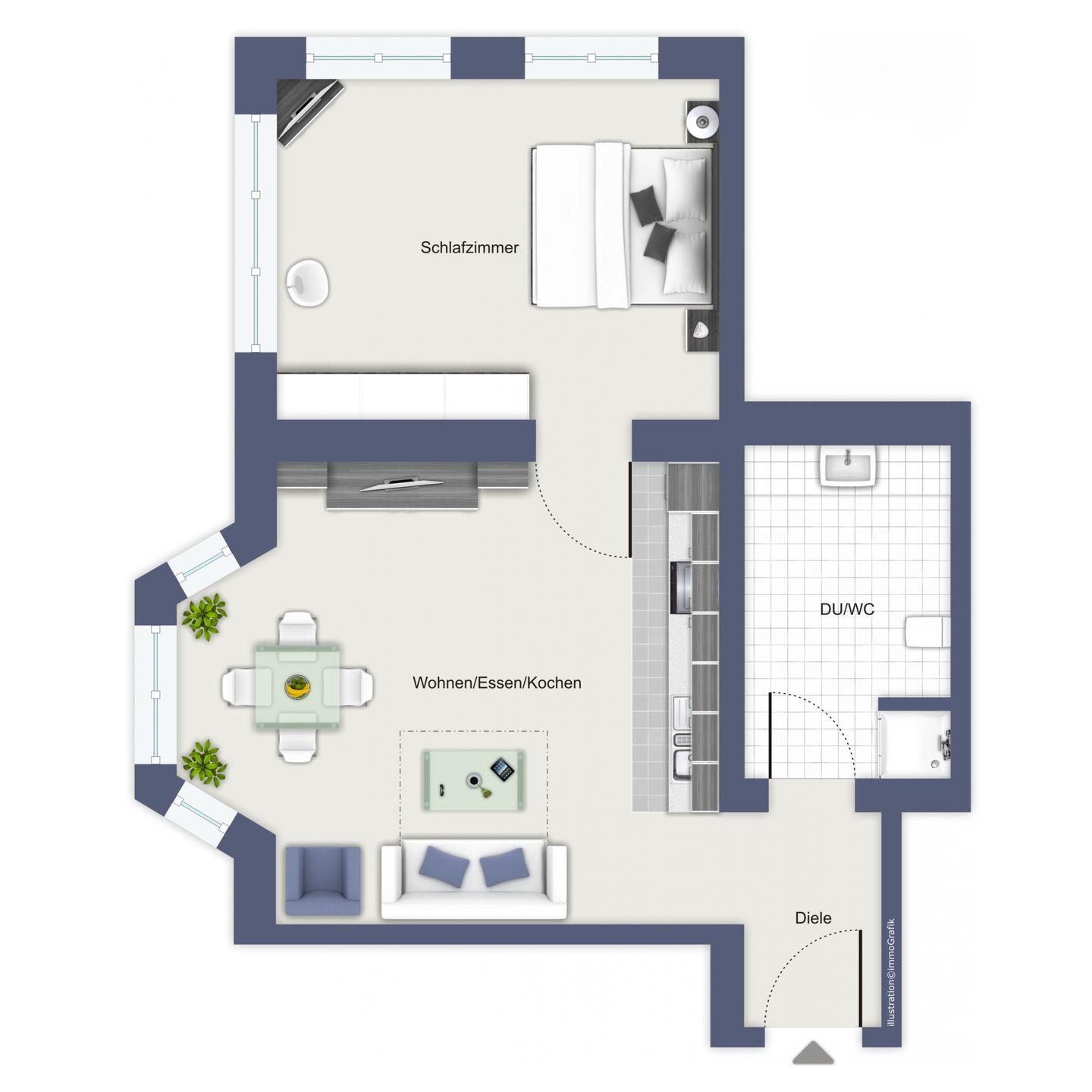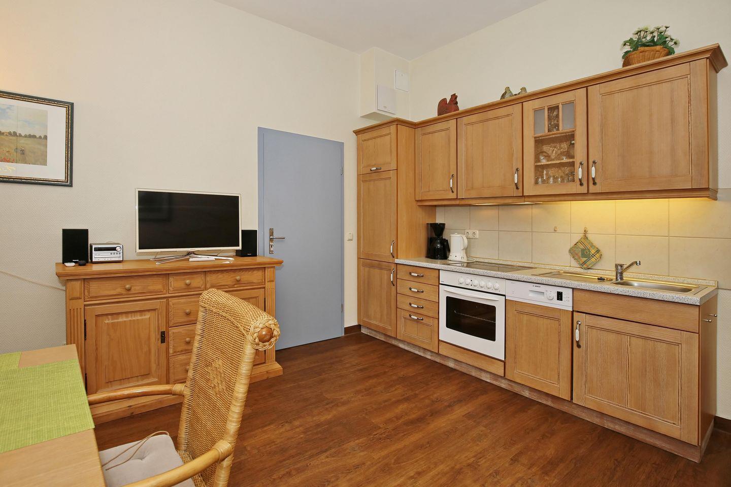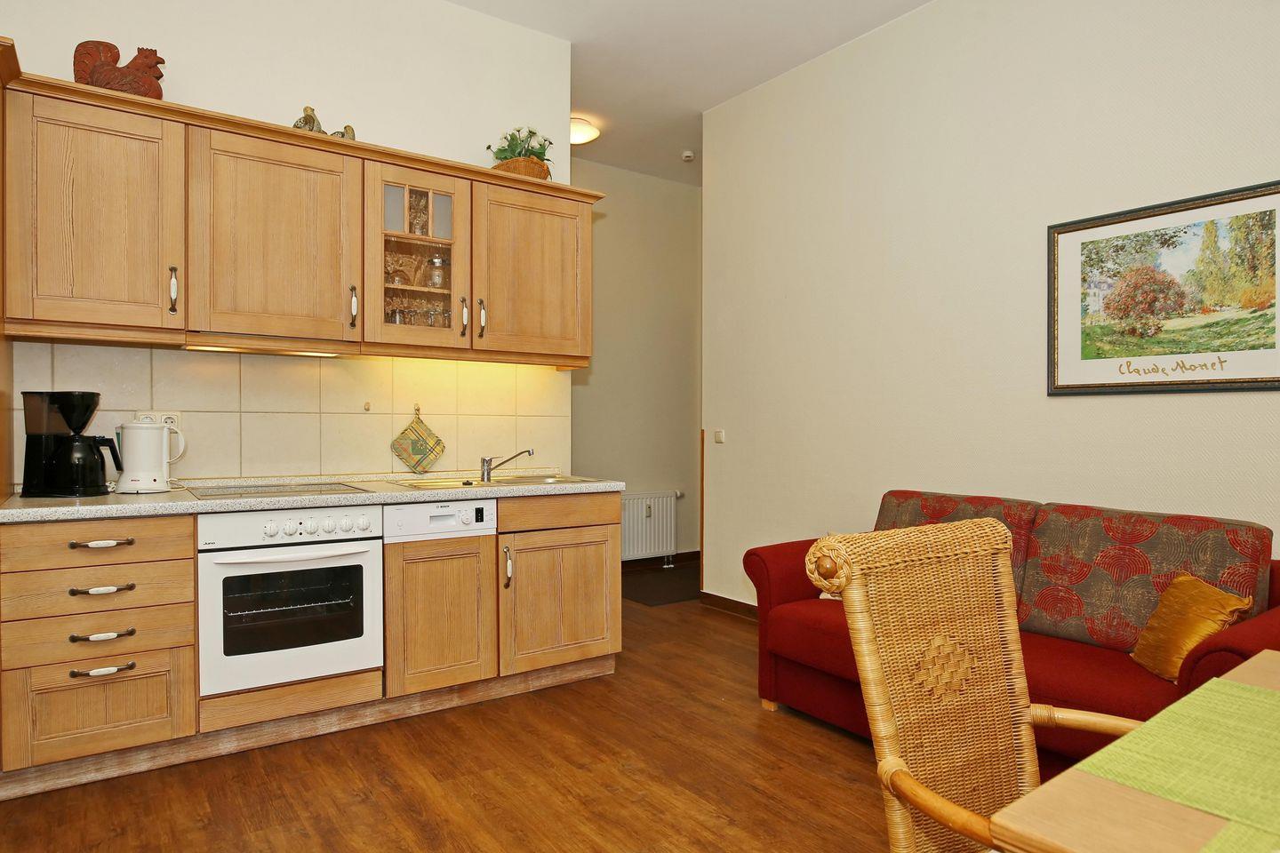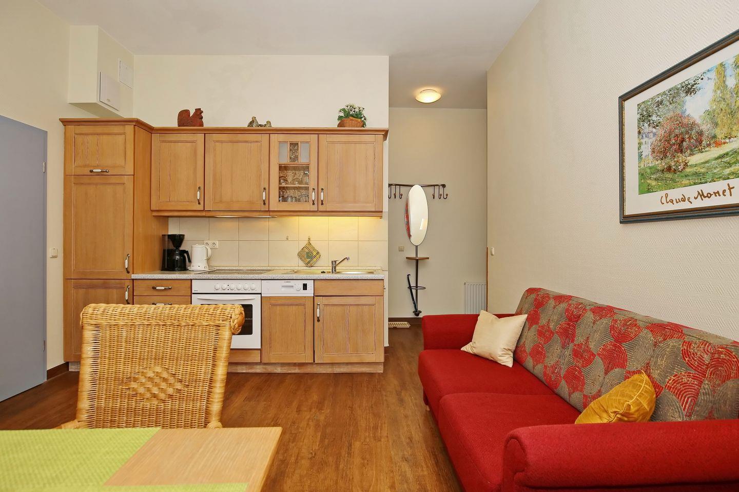 Die im Wohnzimmer integrierte Küchenzeile beinhaltet ein 4-Zonen-Cerankochfeld mit Backofen, einen Kühlschrank mit Gefrierfach und einen Geschirrspüler. Ebenso stehen dir ein Wasserkocher, ein Toaster und eine Kaffeemaschine zur Verfügung.