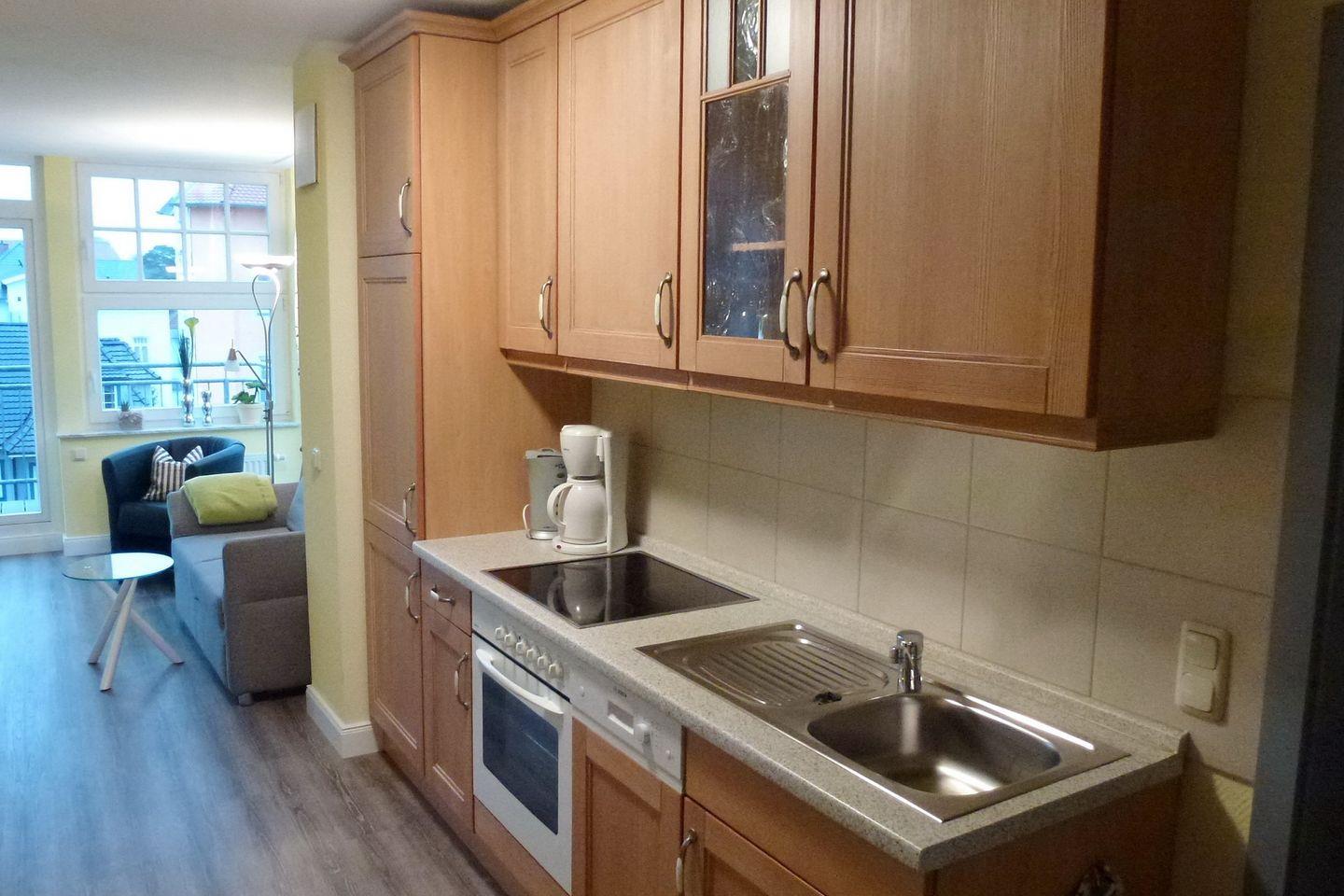 Die Küche ist ebenfalls aus Pinienholz gefertigt und bietet Selbstversorgern allen Komfort. Ausgestattet ist die Küche mit einem 4-Platten-Cerankochfeld, einem Backofen, einem Kühlschrank mit Gefrierfach, einem Geschirrspüler, einem Wasserkocher, einem Toaster und einer Kaffeemaschine.