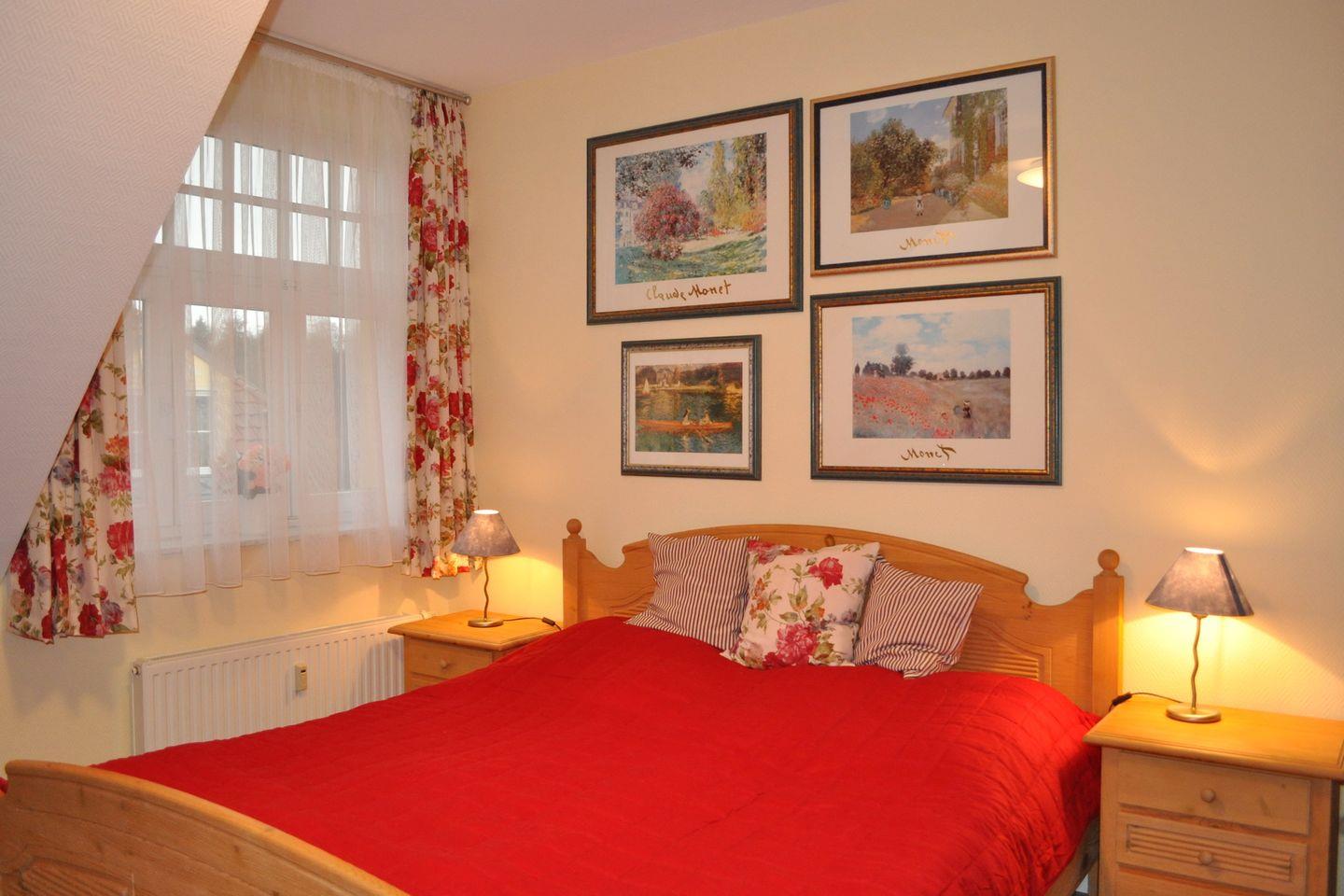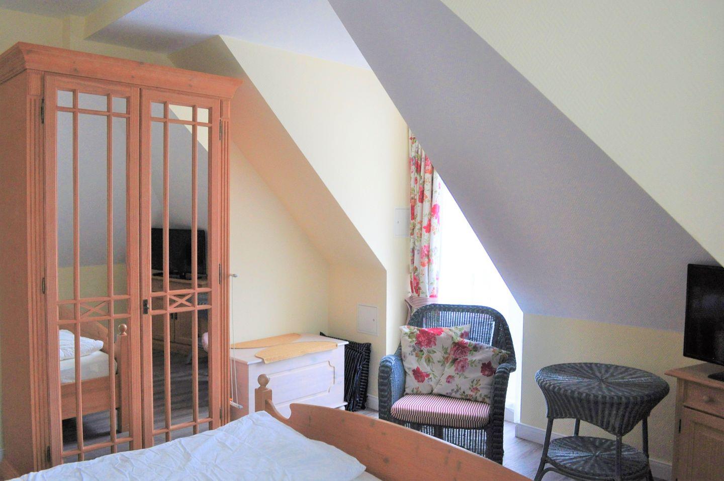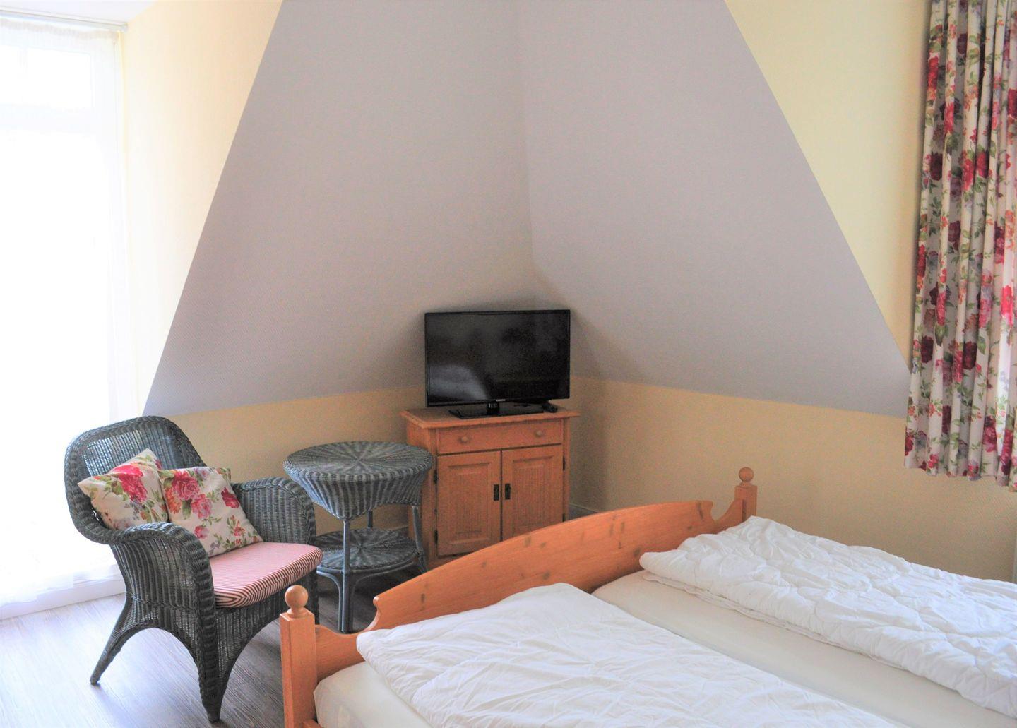 Im Schlafzimmer dieser Ferienwohnung lädt ein Doppelbett (2 x 80 x 200 cm) zum erholsamen Schlaf ein. Kleiderschrank und ein 2. TV gehören ebenfalls zur Ausstattung. Ein zusätzlicher Verdunklungsvorhang sorgt für eine lange Nachtruhe.