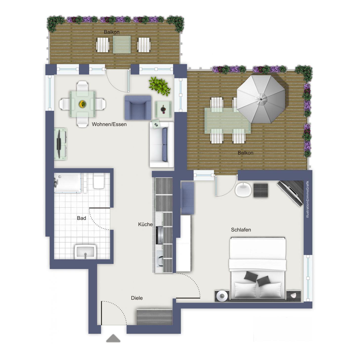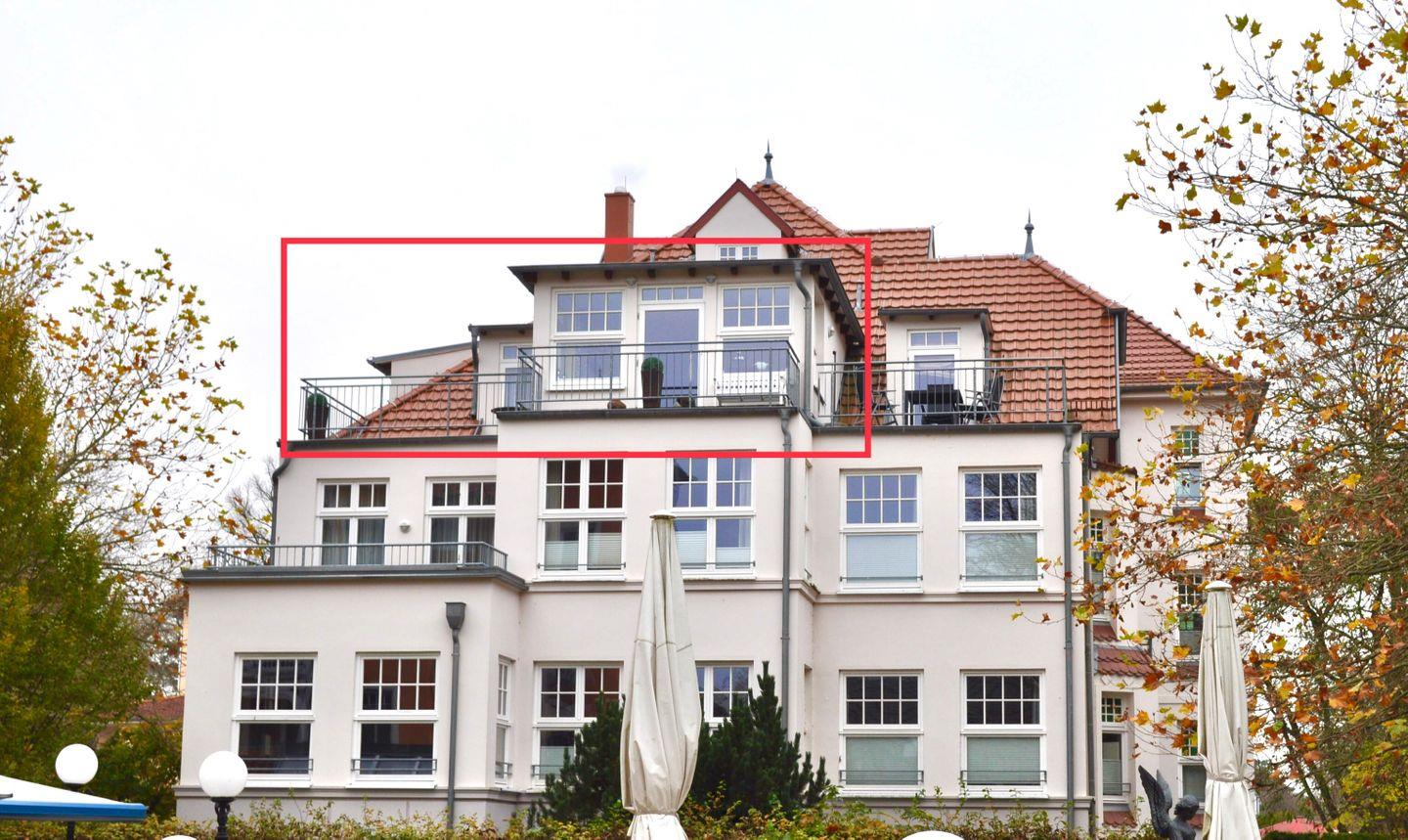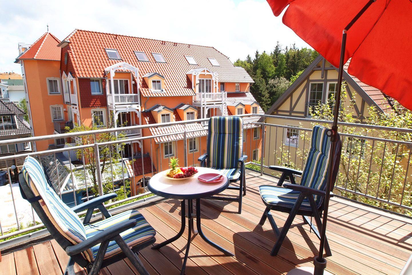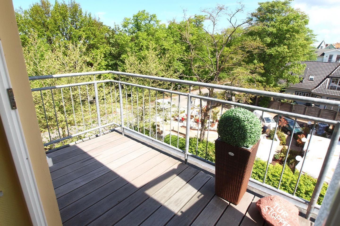 Deine Wohnung Nr. 12 im Haus La Mer ist ein helles 2-Zimmer-Appartement mit einer Größe von ca. 52 m² im Penthouse-Stil. Ein besonderes Highlight ist die große Terrasse. Fast ganzjährig kannst du die Sonne bis zum späten Nachmittag genießen. Der kleine Marmortisch und die gemütlichen Stühle mit Liegefunktion laden zum Entspannen ein. Ein zweiter Balkon mit Sitzbank ist gen Osten gerichtet. In den stillen Wintermonaten, wenn das Laub gefallen ist, wird der Blick zum Meer frei und du kannst das Meeresrauschen hören.