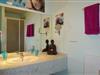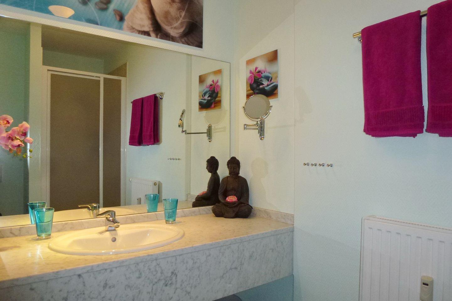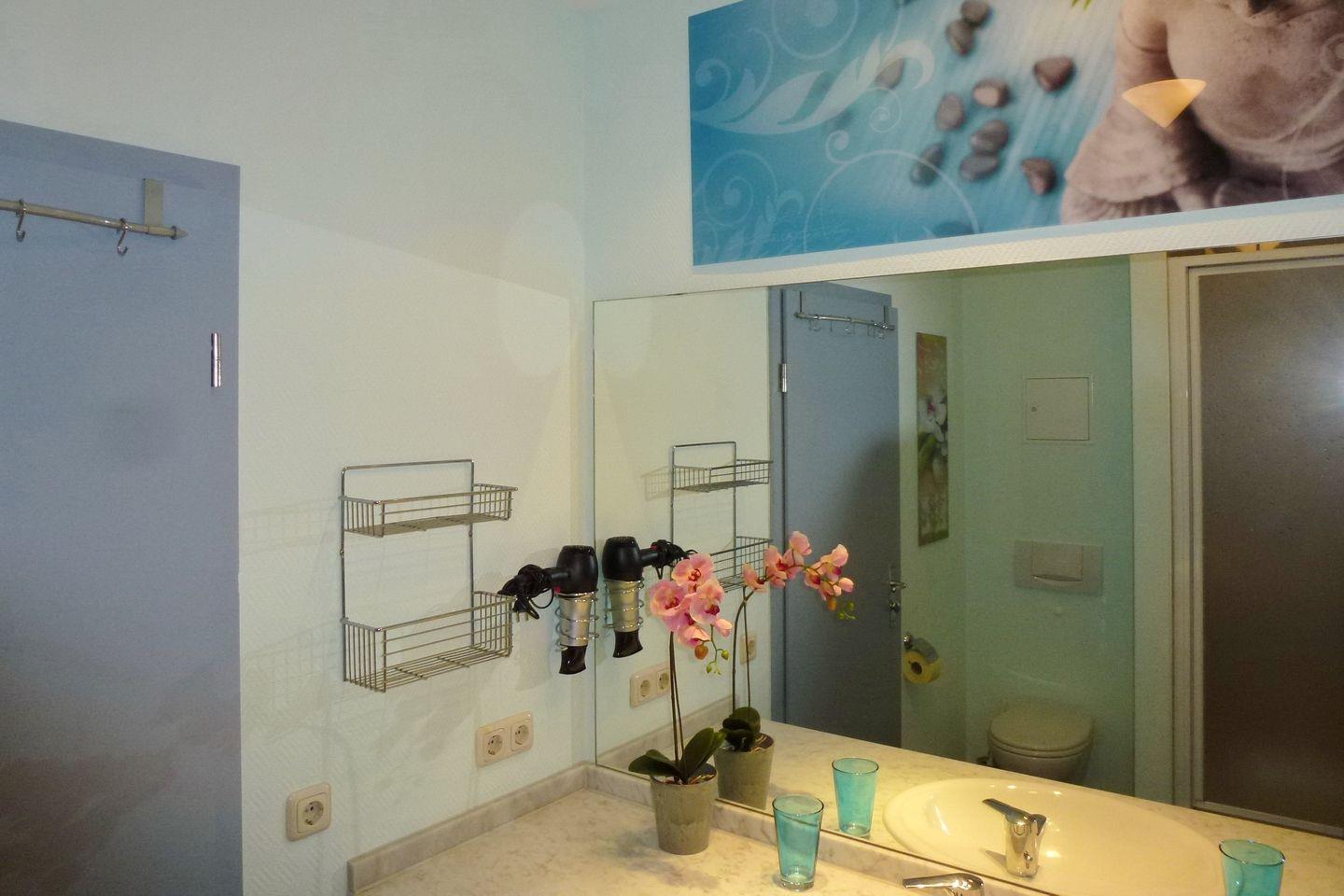 Das großzügige Badezimmer bietet viel Ablageplatz auf der großen Marmorplatte. Ebenso steht ein großflächiger Spiegel, Schminkspiegel und ein leistungsstarker Haartrockner zur Verfügung. Dusche mit Tür und WC.