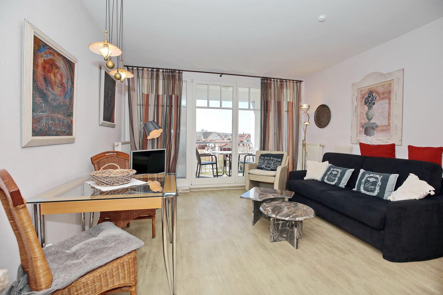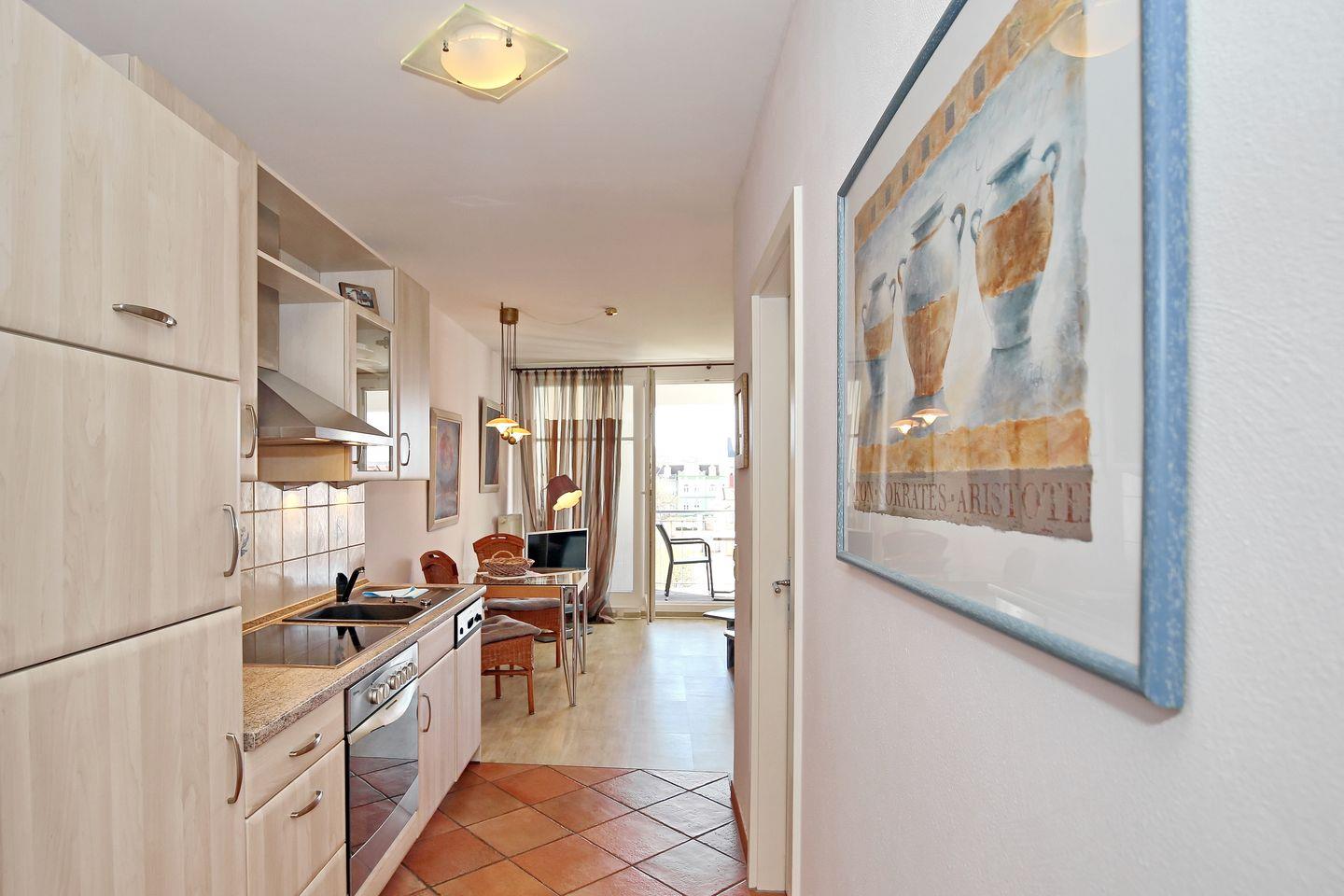 Die Ferienwohnung Nr. 309 in der Ferienanlage Meeresblick ist eine 2-Zimmer-Wohnung für bis zu 2 Personen. Die Wohnung liegt in der 3. Etage auf der Südseite des Hauses und verfügt über einen Balkon, auf dem Sie die Mittagssonne genießen können.