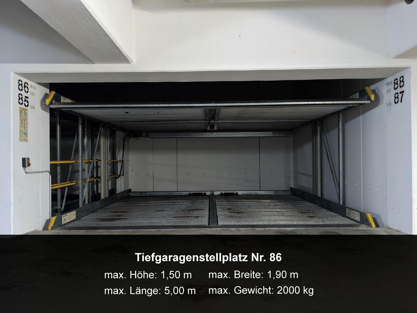Zur Ferienwohnung gehört der Kfz-Stellplatz Nr. 86 in der Tiefgarage (max. Höhe 1,50 m, max. Gewicht 2.000 kg).