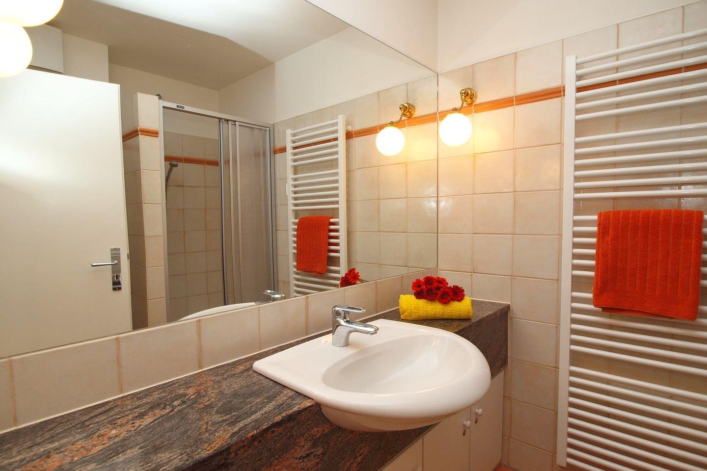 Die Ferienwohnung verfügt über ein gefliestes Duschbad mit WC und einen Föhn. Für deine Waschutensilien findest du genügend Platz auf den Ablageflächen. Im Wohnbereich wurde ein Vinylboden verlegt, im Küchenbereich und im Bad findest du Fliesen vor.
