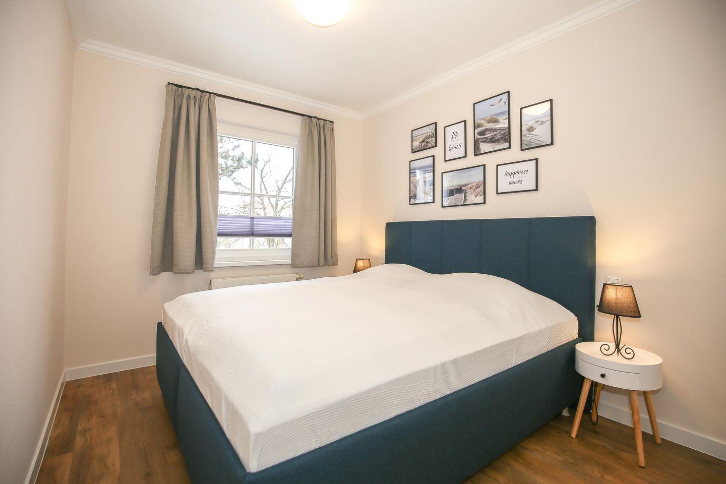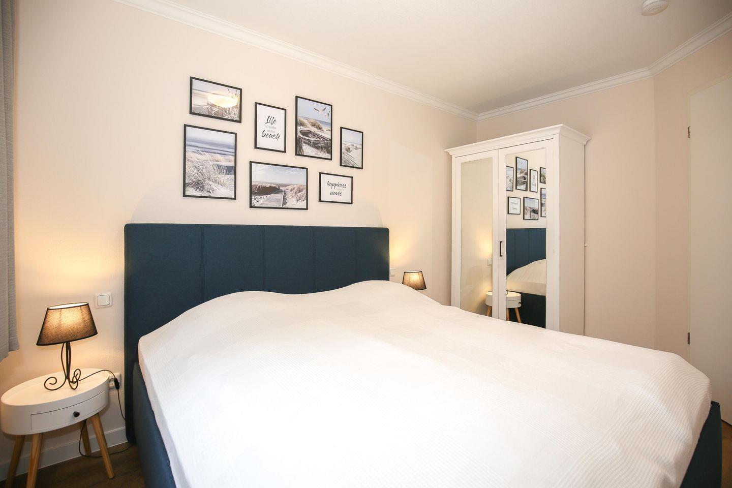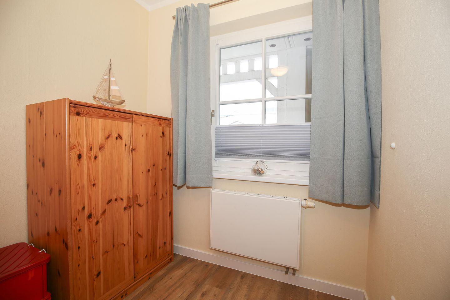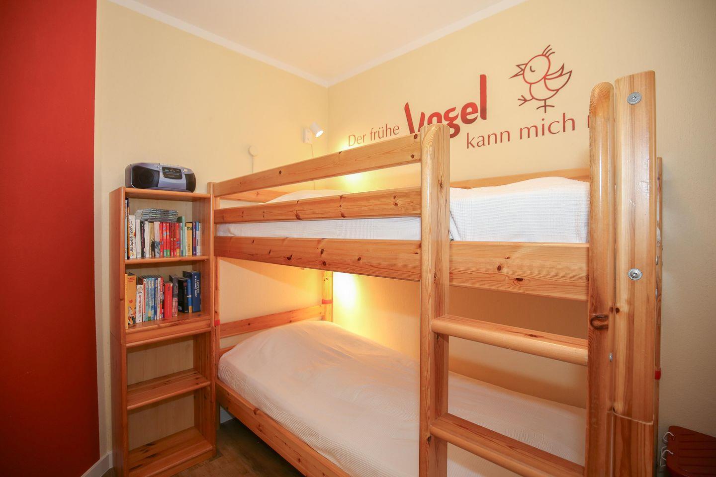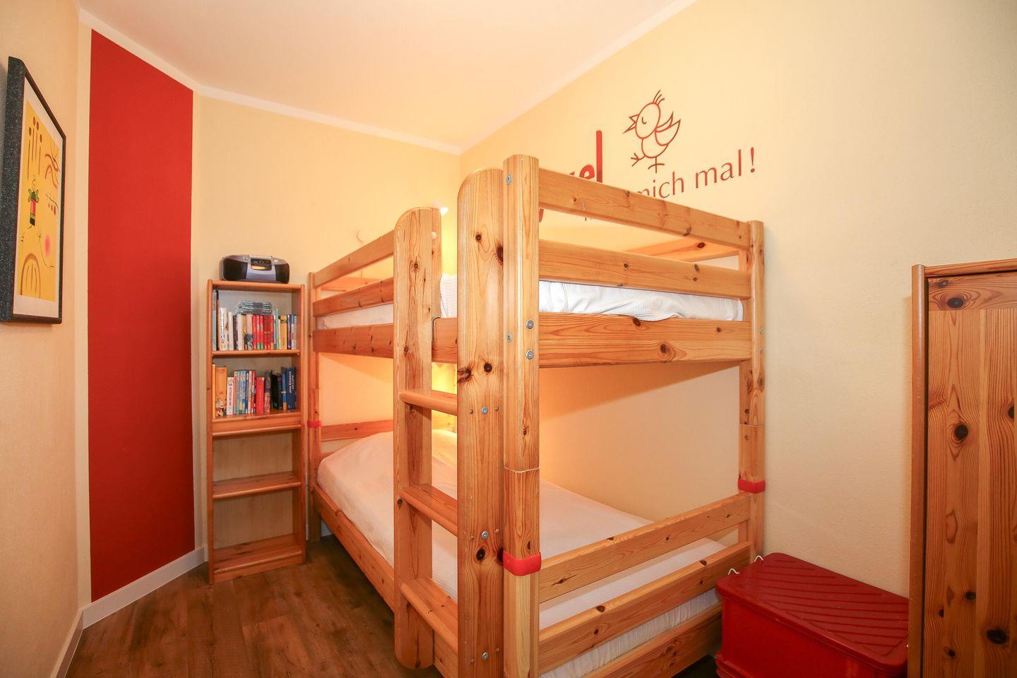 Erholung versprechen die beiden Schlafzimmer. Im ersten Schlafzimmer der Ferienwohnung steht ein Doppelbett (2 x 90 x 200 cm) und im zweiten Schlafzimmer ein Etagenbett (90 x 200 cm). Für deine Urlaubsgarderobe gibt es in beiden Räumen einen Kleiderschrank. Besonderheit im zweiten Schlafzimmer ist eine Auswahl an Büchern, die dir die Zeit in der Ferienwohnung und am Strand vertreiben wird. Zur Verdunklung hängen an den Fenstern Vorhänge.