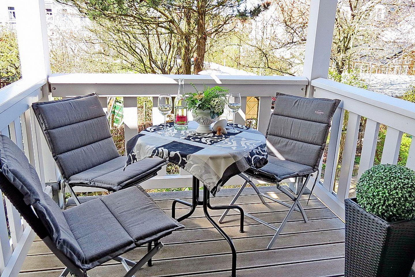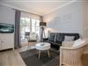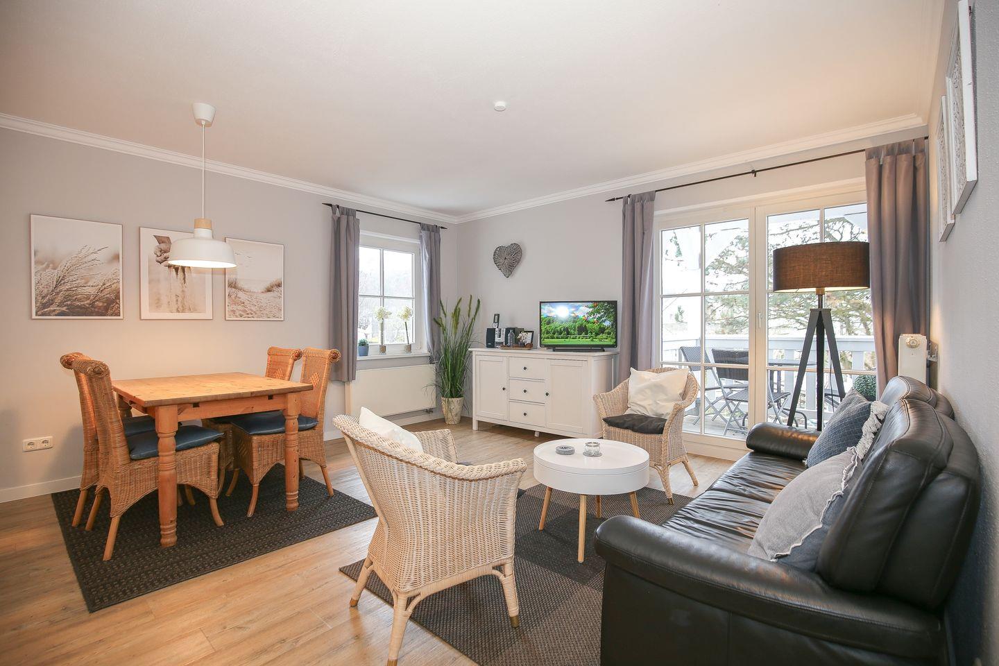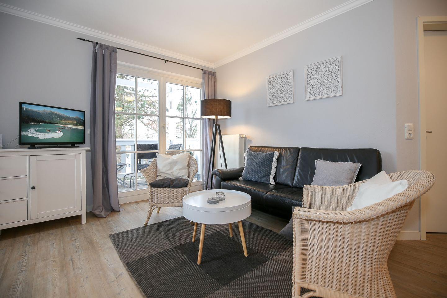 In dem großen, offenen Wohnbereich erwartet dich ein bequemes Sofa und zwei Sessel. Für Abwechslung am Abend sorgen eine Stereoanlage und ein Flachbild-TV. Genieße die frische Ostseeluft auch auf dem Balkon, diesen erreichst du direkt vom Wohnbereich aus. WLAN steht dir in der Wohnung zur Verfügung.