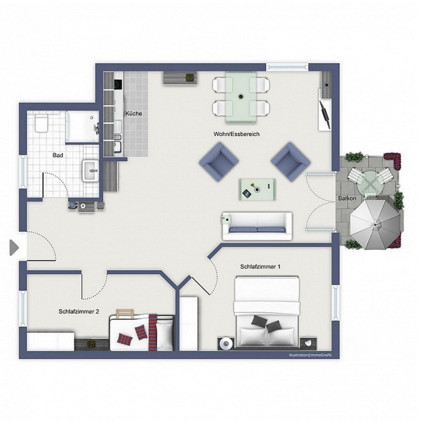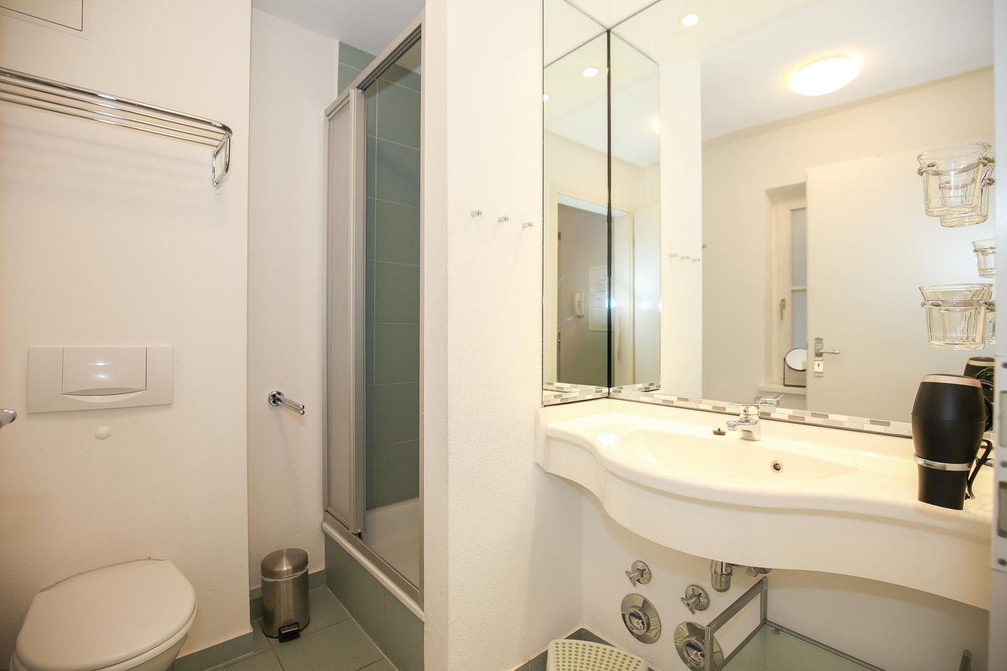 Das Tageslicht-Badezimmer bietet dir eine Dusche, WC, großen Waschtisch mit Spiegel und einen Föhn. In den Nassbereichen erwartet dich ein Fliesenboden, der Wohnbereich, sowie die Schlafzimmer sind mit hochwertigem Design-Belag ausgestattet.