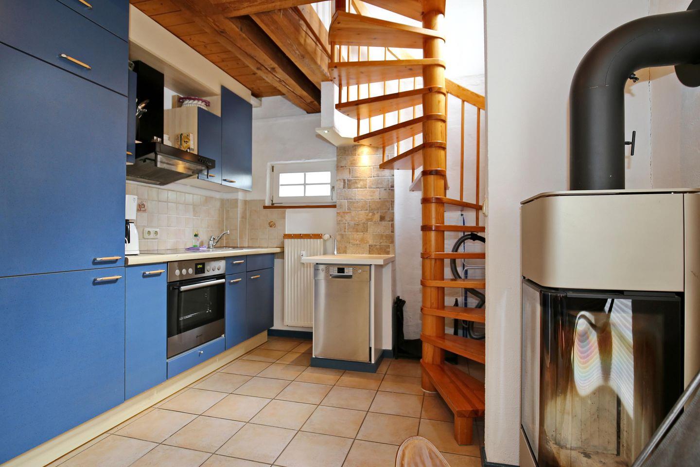 In der zum Wohnbereich angrenzenden Küche stehen dir ein Herd mit einem 4-Platten-Cerankochfeld mit Backofen, ein Kühlschrank mit Gefrierfach sowie ein Geschirrspüler zur Verfügung. Eine Kaffeemaschine, ein Wasserkocher und ein Toaster komplettieren die Küchenausstattung.