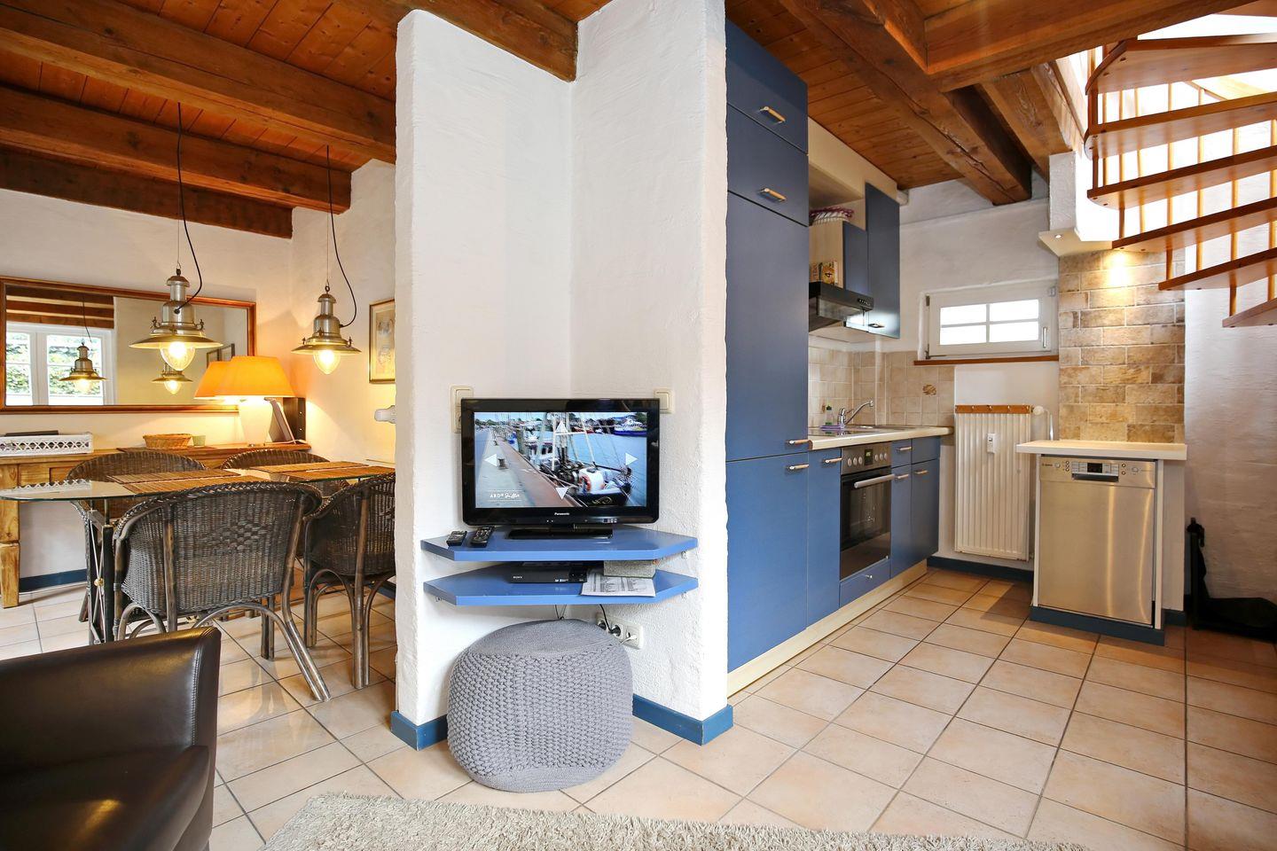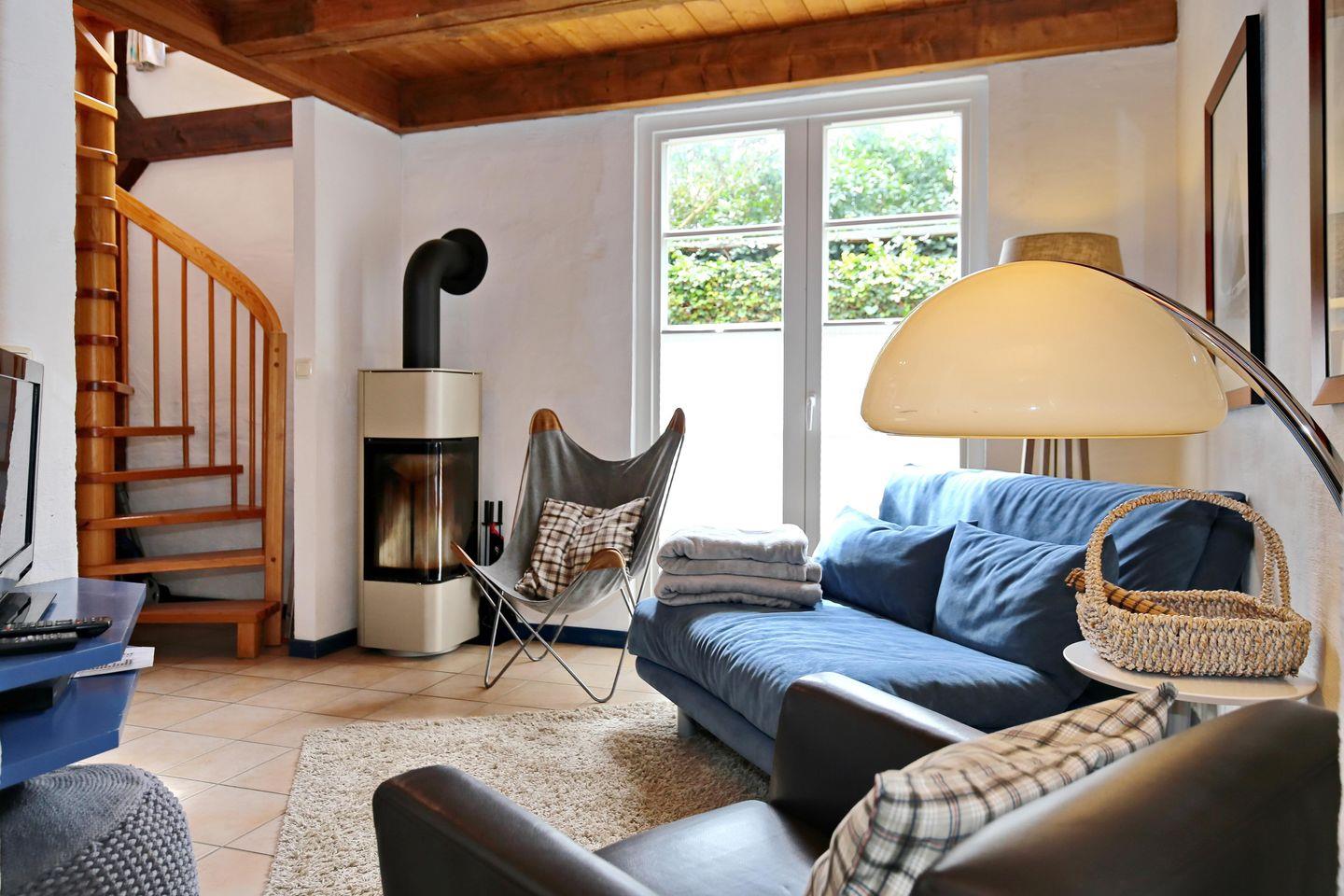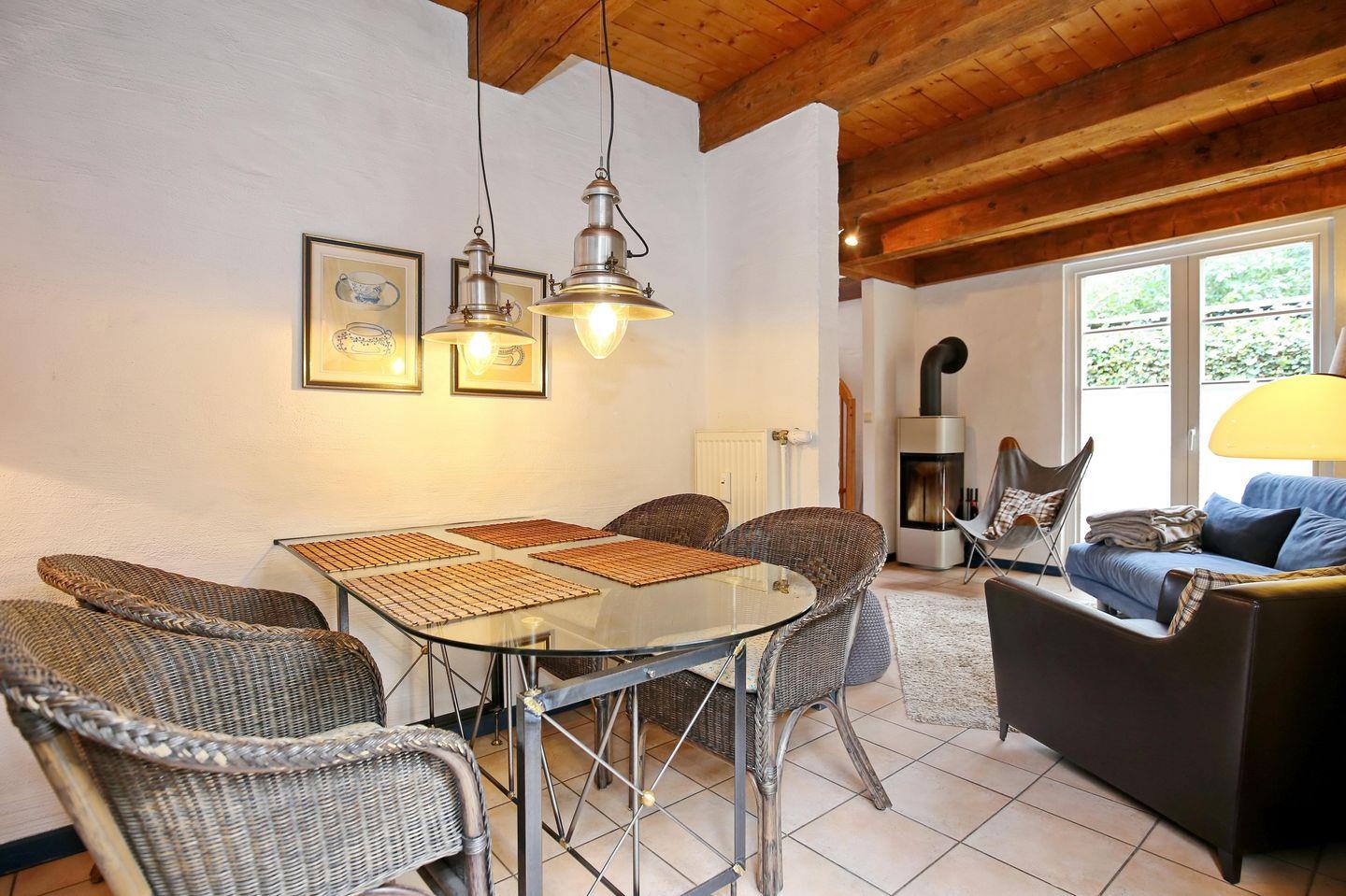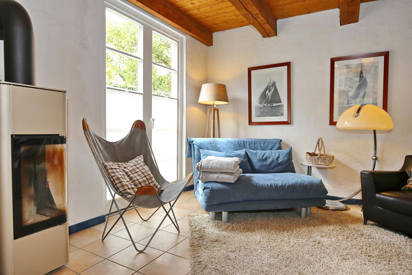 Der Wohnbereich der Ferienwohnung liegt im Erdgeschoss und ist mit einer gemütlichen ausziehbaren Schlafcouch (120 x 200 cm) und zwei Sesseln, sowie einer Blu-ray-Anlage und einem Flachbild-TV ausgestattet. Im Wohnbereich befindet sich auch ein Kaminofen. Durch ein großes Südfenster wird der Wohn-und Essbereich lichtdurchflutet und der anschließende Essbereich lädt zu gemeinsamen Mahlzeiten ein.