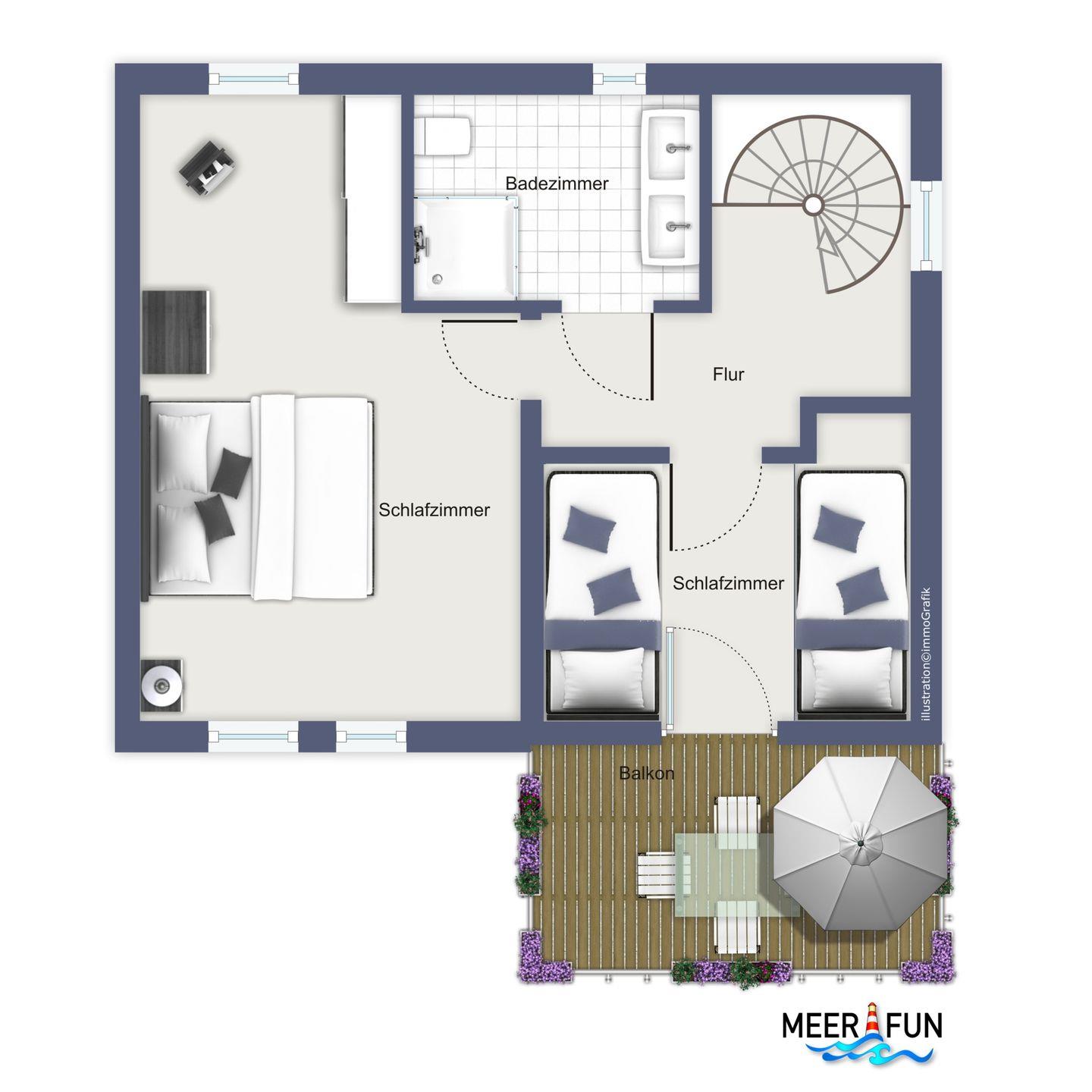 Über eine Wendeltreppe gelangst du in das Obergeschoss und damit zu den Schlafzimmern. Im ersten Schlafzimmer bietet dir ein Doppelbett (2 x 90 x 200 cm) eine erholsame Nachtruhe. Zwei Nachttische und ein Kleiderschrank können für dein Urlaubsgepäck genutzt werden. Das zweite Schlafzimmer ist mit 2 Einzelbetten (90x200cm) eingerichtet. Du kannst jeweils Vorhänge als Sichtschutz oder zum Verdunkeln verwenden. Im Flur befindet sich ein weiterer Kleiderschrank.