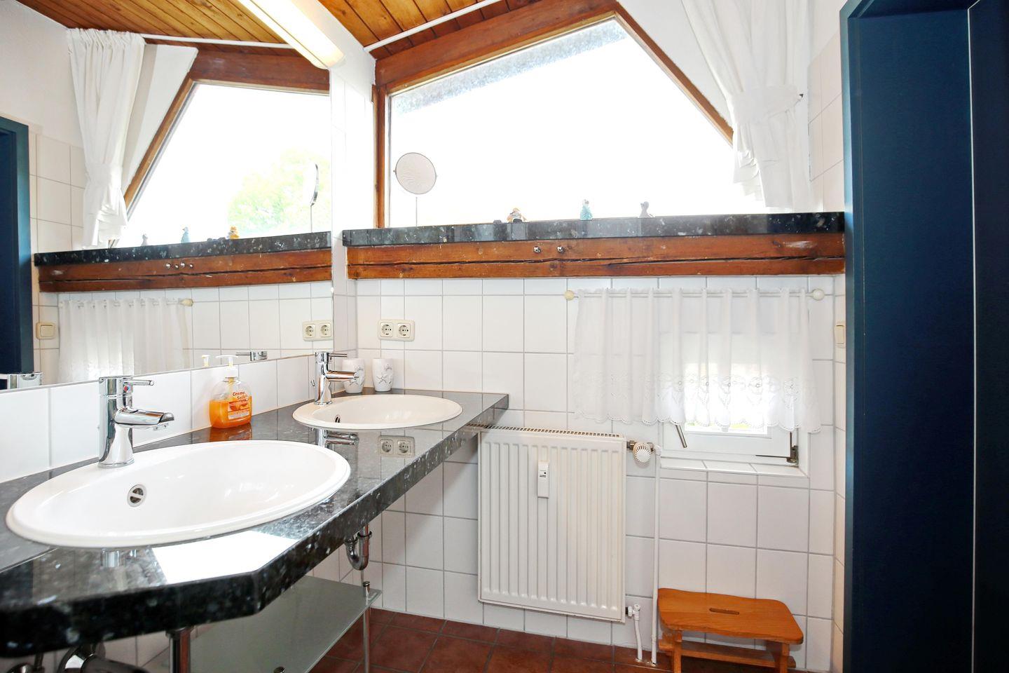 Das Tageslichtbad ist mit einer Dusche und einem WC ausgestattet. Über dem Doppelwaschtisch hängt ein großer beleuchteter Spiegel. Das Bad ist gefliest. Im Schlafzimmer ist Teppich verlegt. Der Wohnbereich verfügt über Holzdielen. In der Sitzecke sorgt ein großer Teppich für Behaglichkeit.