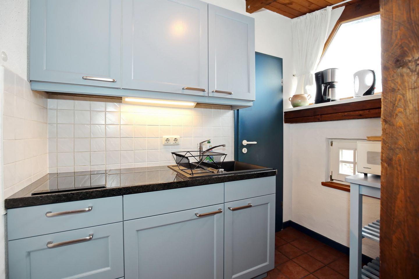 Die Küchenzeile schließt sich an den Wohnbereich an und ist mit einem Kühlschrank mit Gefrierfach, einem 2-Platten-Cerankochfeld, einer Kaffeemaschine, einer Mikrowelle und einem Toaster gut ausgestattet.