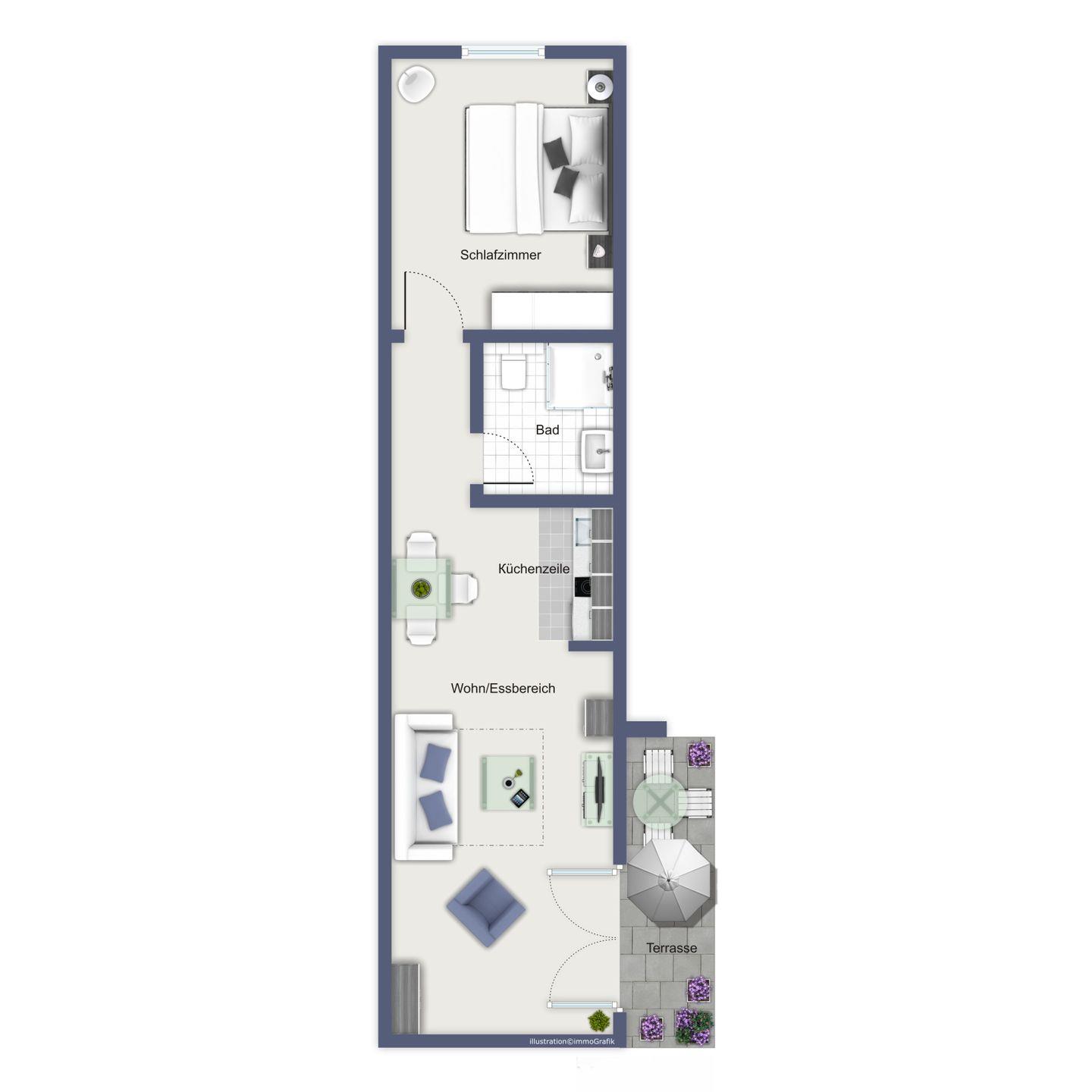 Du betrittst die im Erdgeschoss gelegene Ferienwohnung über die Terrasse. Es ist eine kleine, praktische 2-Zimmer-Ferienwohnung mit einer Größe von etwa 39 m². Die Wohnung unterteilt sich in einen gemütlichen Wohnbereich mit Küchenzeile, ein Duschbad und ein Schlafzimmer. Die nach Süden ausgerichtete Terrasse verspricht Sonnenstunden. Genieße während deines Urlaubs auch einen Strandbesuch. Es sind nur etwa 750 Meter bis zum feinen Ostseestrand.