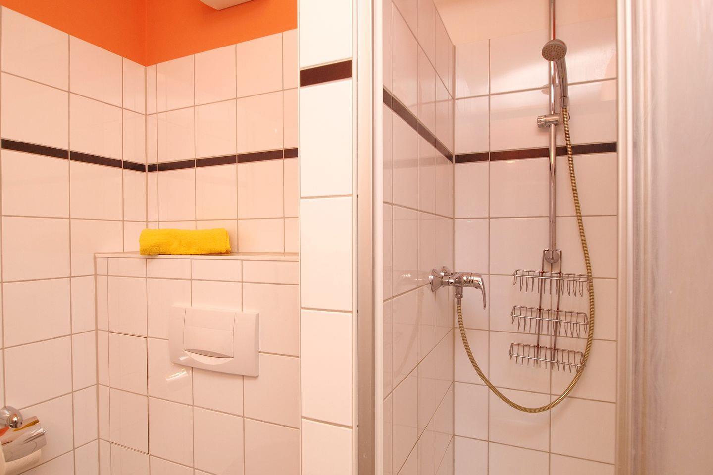 Die Ferienwohnung verfügt über ein gefliestes Duschbad mit WC, einen Föhn und einen Kosmetikspiegel.