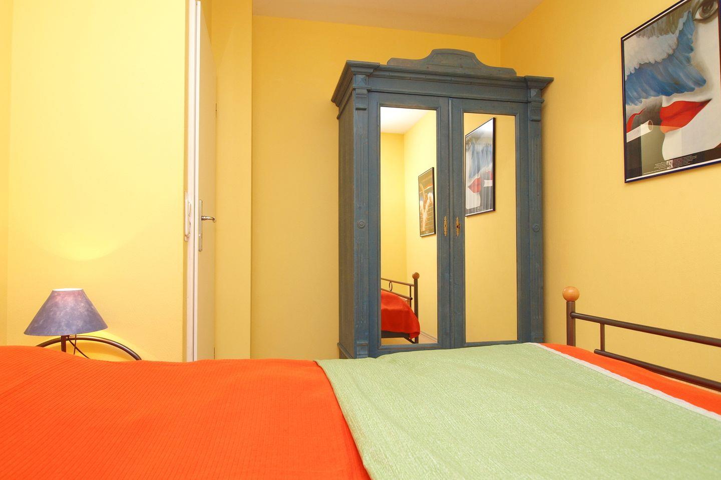Im Schlafzimmer dieser Ferienwohnung lädt dich ein Doppelbett (2 x 90 x 200 cm) zum erholsamen Schlaf ein. Ein Rollo und Vorhänge dienen zum Verdunkeln. Ein Kleiderschrank bietet viel Stauraum (das Schlafzimmerfenster geht zum Atrium raus).