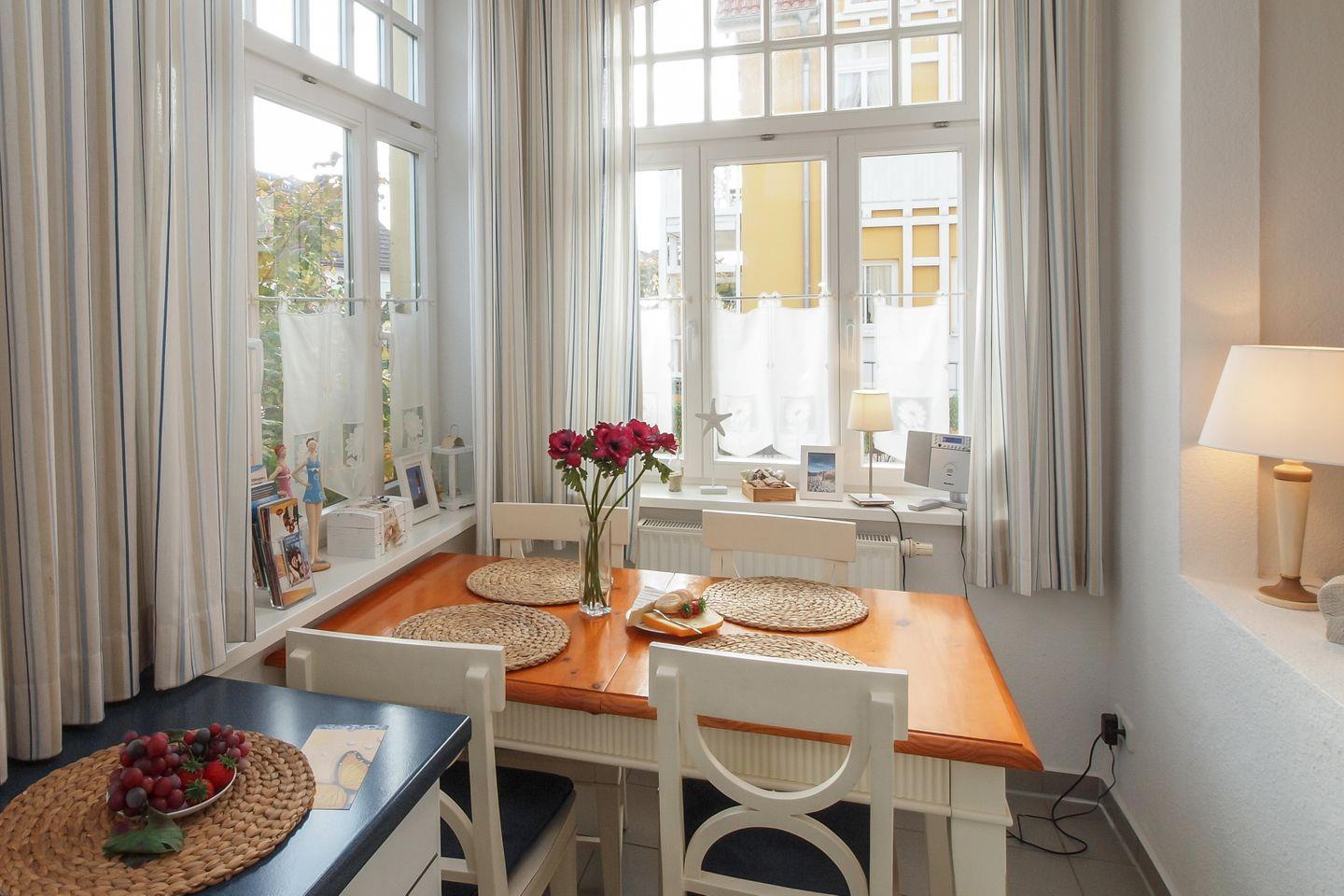 Dank der hohen Fenster hat dieses mit viel Liebe fürs Detail eingerichtete Urlaubsdomizil einen ganz besonderen Charme. Über wenige Stufen gelangst du in die im Hochparterre gelegene, 47 m² große Ferienwohnung. Erwartet wirst du von einem separaten Schlafzimmer, einem Duschbad, einem hellen Wohnbereich mit angrenzender Küchenzeile und gemütlicher Essecke. Zum feinen Kühlungsborner Sandstrand sind es von hier aus nur ca. 300 Meter.
