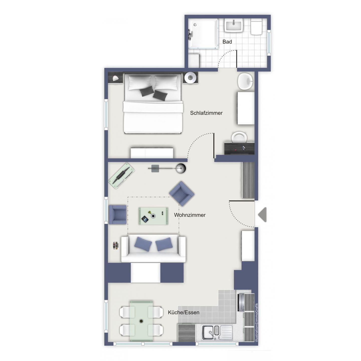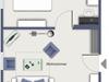 Zwischen dem Wohnbereich und der gut sortierten Küchenzeile fungiert eine halbhohe Wand als Raumteiler. Im angrenzenden Küchenbereich gehören ein 4-Ceran-Kochfeld, ein Backofen, ein Kühlschrank mit Gefrierfach sowie ein Toaster, eine Kaffeemaschine, ein Mixer und ein Wasserkocher zur weiteren Ausstattung der Wohnung. Genieße gemeinsame Mahlzeiten am großen Esstisch.
