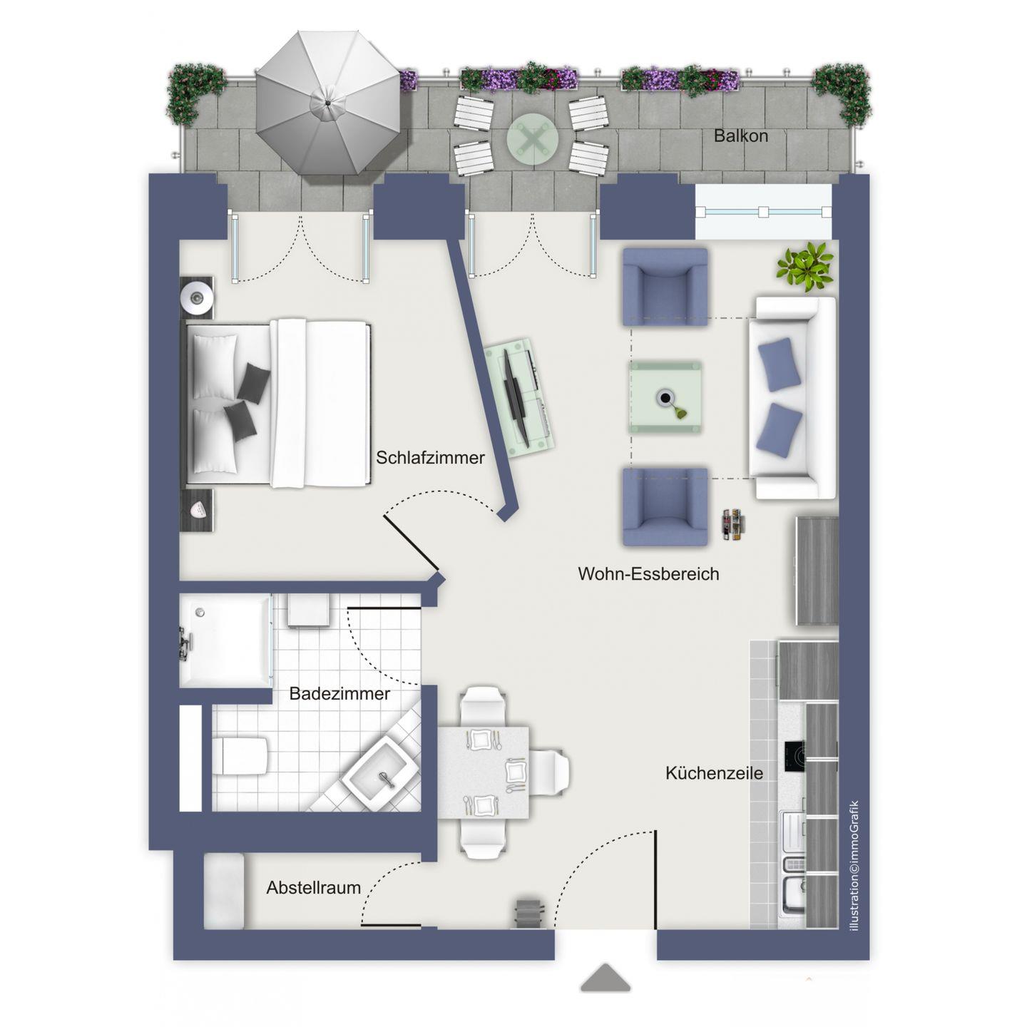 Ein tiefer gelegter Duscheinstieg und ein Föhn befinden sich im komfortabel gestalteten Duschbad/WC. In der Wohnung wurde Laminat im Wohnbereich, Eingangsbereich und Schlafzimmer verwendet. Das Bad ist gefliest.