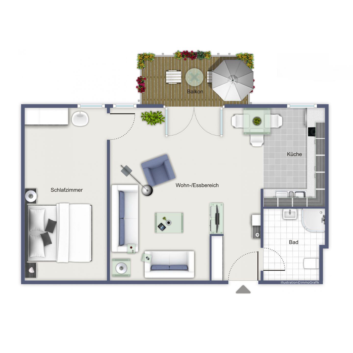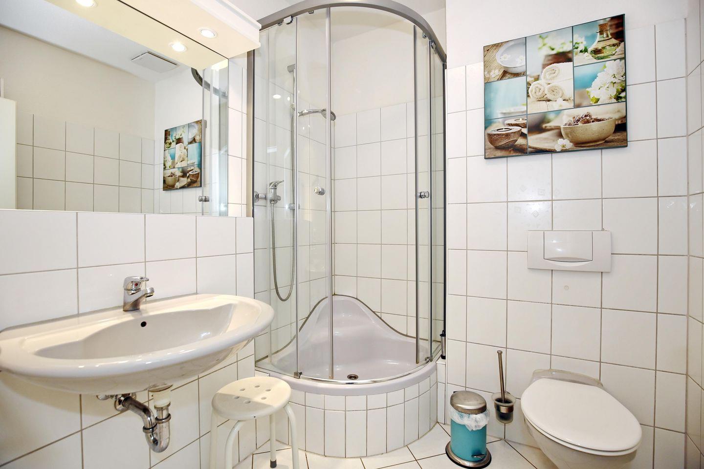 Im Badezimmer befinden sich eine Dusche, ein WC sowie genügend Ablagefläche für deine Waschutensilien. Außerdem gehört ein Föhn zur Ausstattung. Als Bodenbelag wurde in der Wohnung ein Design-Belag gewählt, für die Küche und das Duschbad - Fliesen. Im Schlafzimmer befindet sich ein Teppichboden.