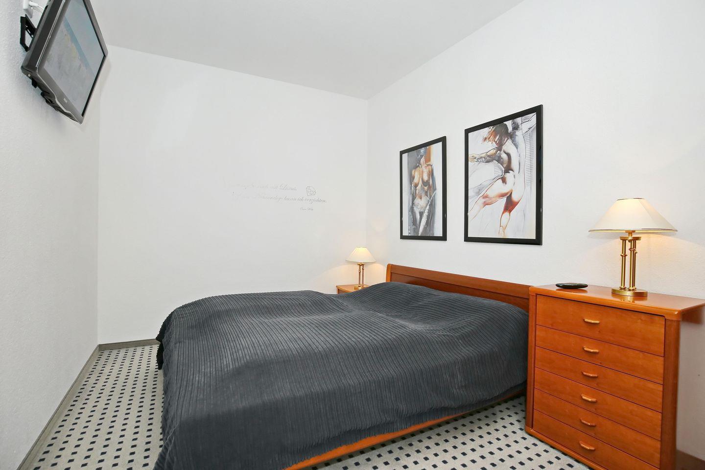 Im Schlafzimmer der Ferienwohnung stehen ein gemütliches Doppelbett (2x90cmx200cm), ein zweiter Fernseher und ein Kleiderschrank für dich bereit. Hier findest du genügend Stauraum für deine Urlaubsutensilien. Zur Verdunklung wurden an den Fenstern Gardinen angebracht.