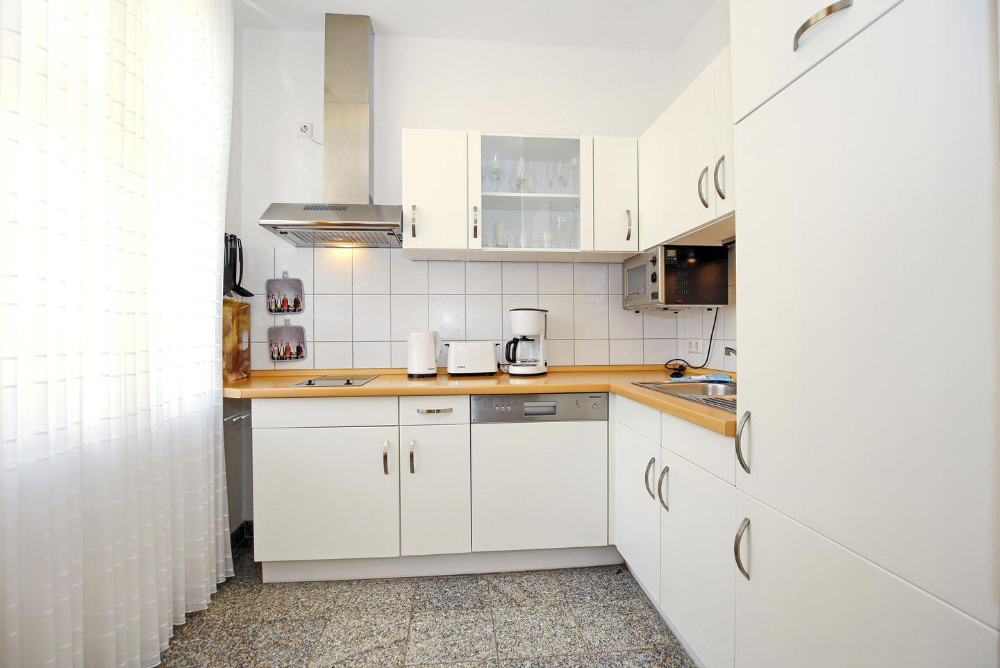 An den Wohnraum angrenzend findest du außerdem die funktional eingerichtete Küchenzeile. Diese verfügt über ein 2-Platten-Cerankochfeld, einen Geschirrspüler, eine Mikrowelle, einen Backofen, einen Kühlschrank mit Gefrierfach sowie einen Wasserkocher, einen Toaster und eine Kaffeemaschine. Am Esstisch haben bis zu 3 Personen Platz.