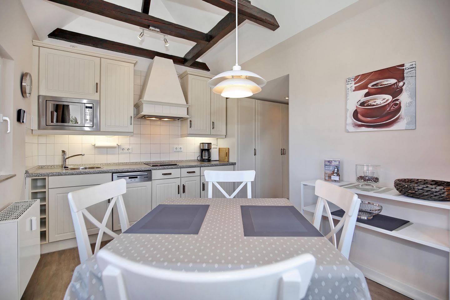 Die komplett eingerichtete Küchenzeile inkl. Mikrowelle, Geschirrspüler, 2-Platten-Cerankochfeld und Kühlschrank mit Gefrierfach lässt keine Wünsche für Hobbyköche offen. Ein Wasserkocher, ein Toaster und eine Kaffeemaschine komplettieren diesen Bereich.