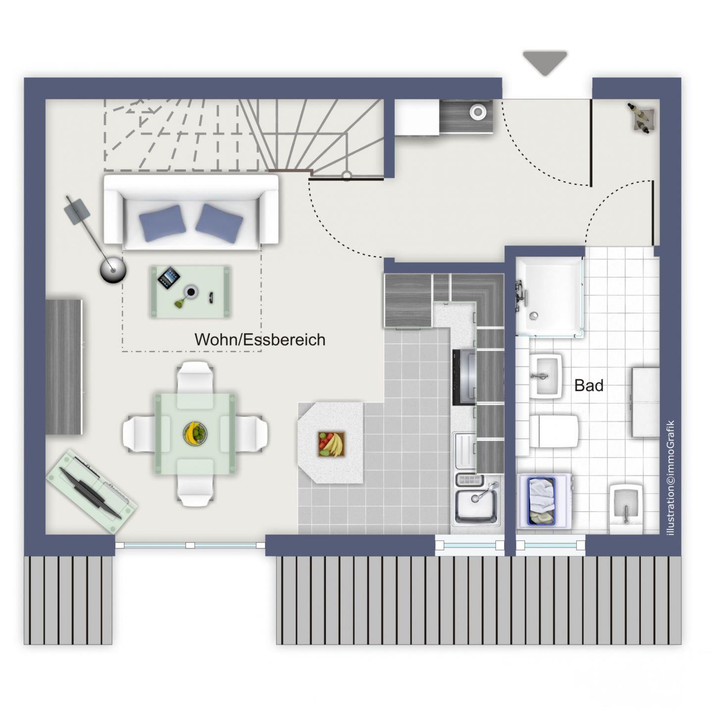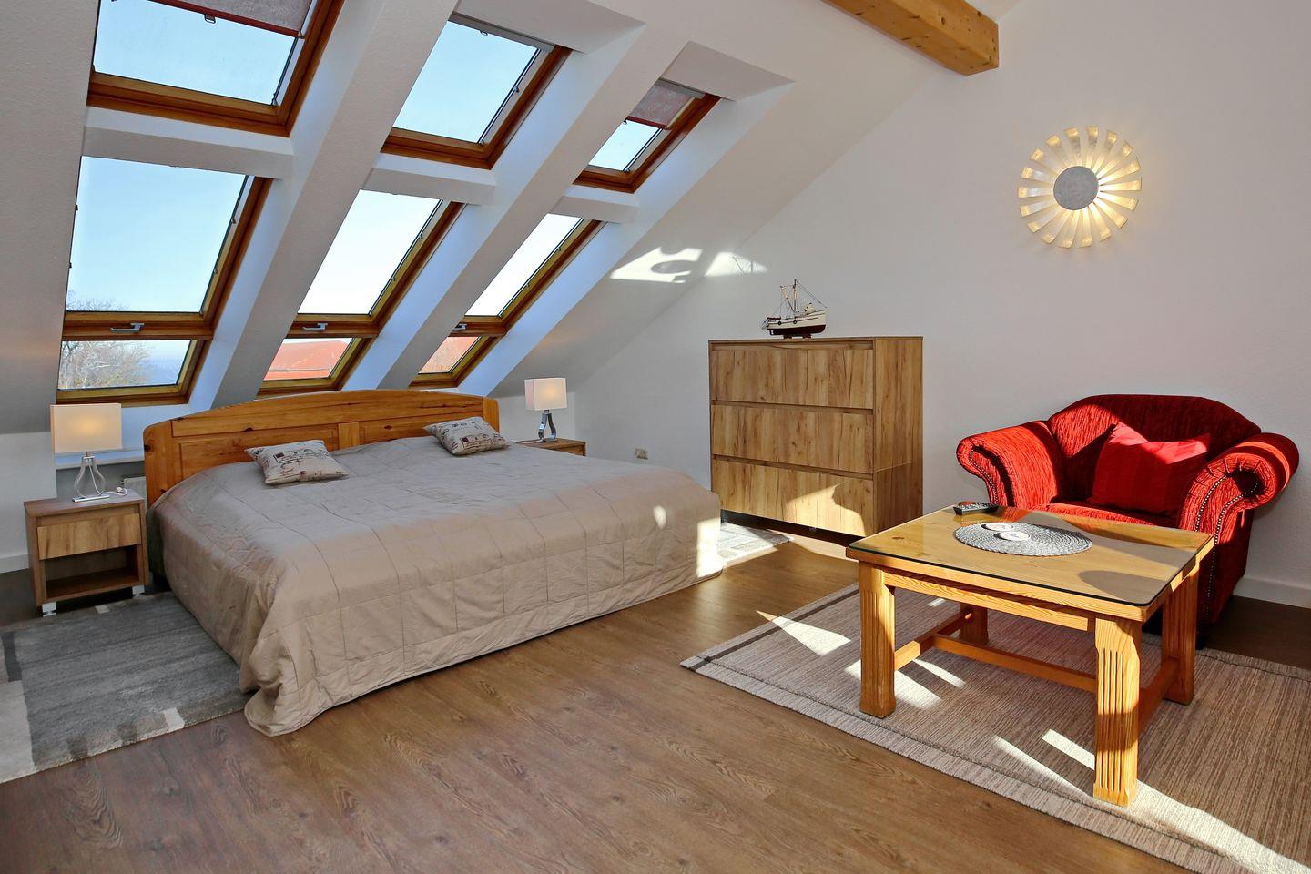 Über eine Wendeltreppe gelangst du in das Wohn- und Schlafzimmer der Ferienwohnung. Der Wohnbereich mit Zugang zur Dachterrasse ist mit einer gemütlichen Couch, einem passenden Sessel und einem Flachbild-TV eingerichtet. Du kannst dich kostenlos in den vorhandenen WLAN-Anschluss einloggen.