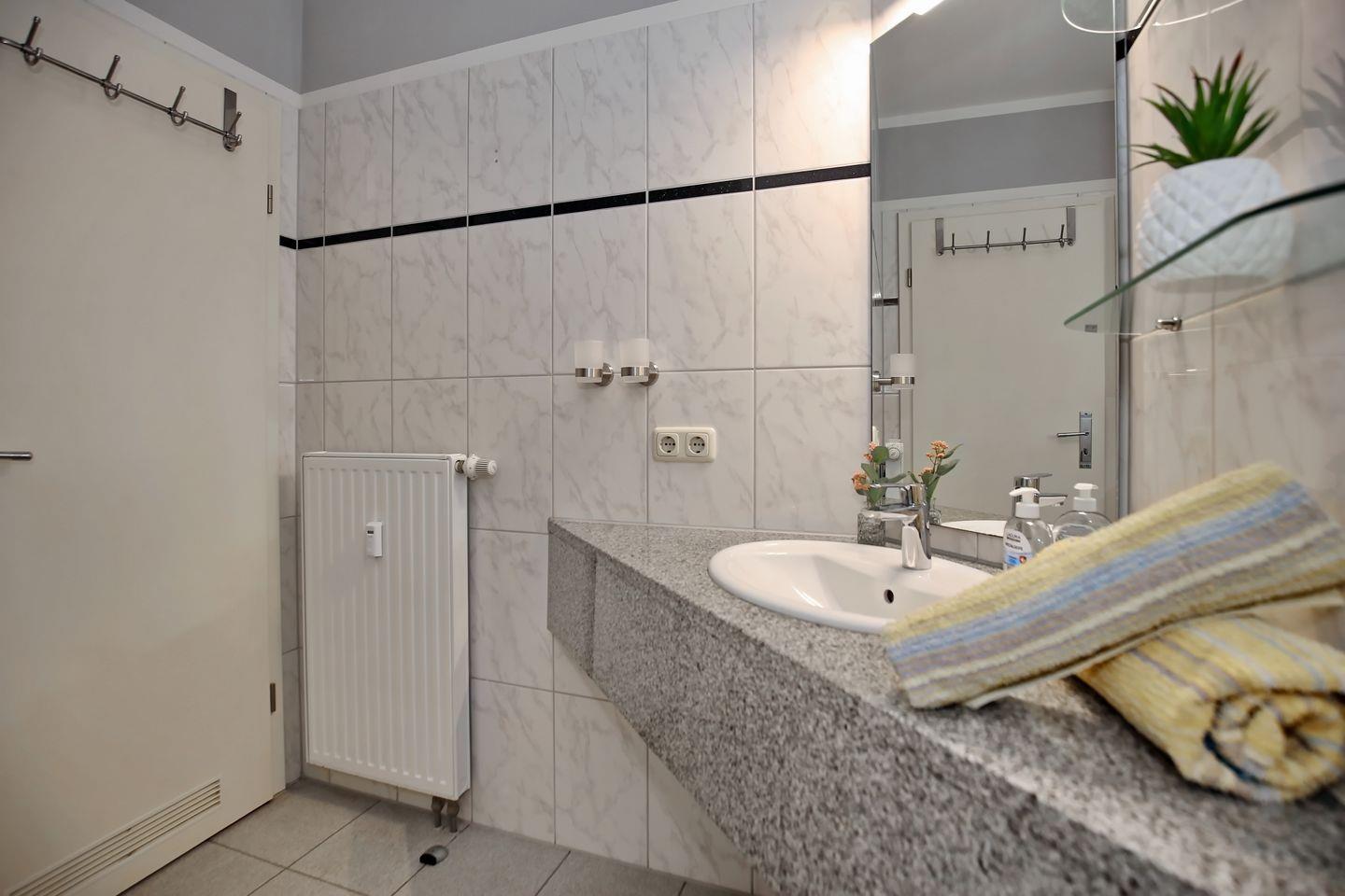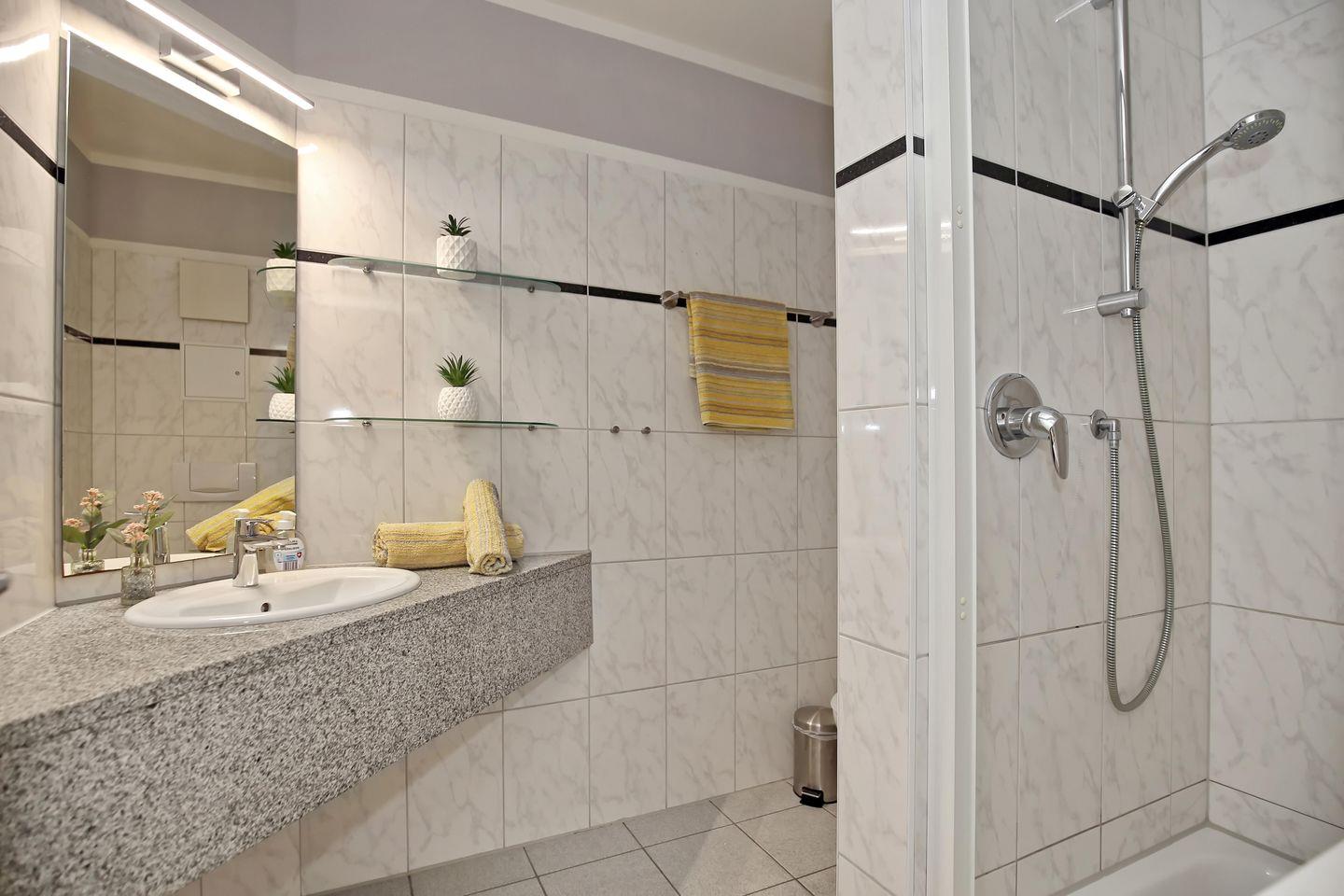 Das geflieste Badezimmer verfügt über einen Waschtisch, eine Dusche und ein WC. In der gesamten Ferienwohnung wurde Laminat verlegt.