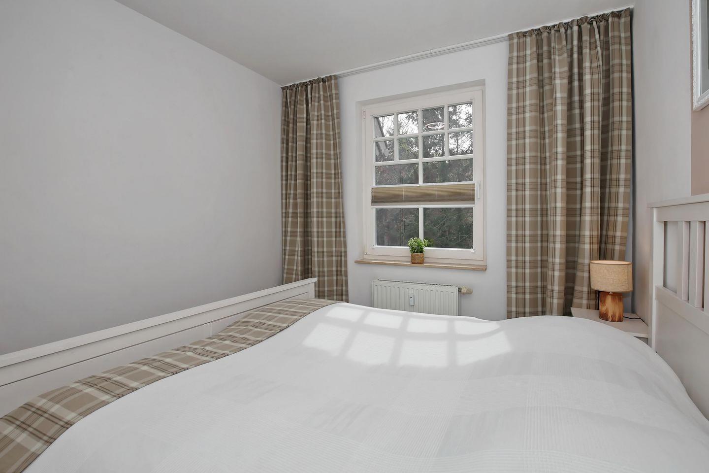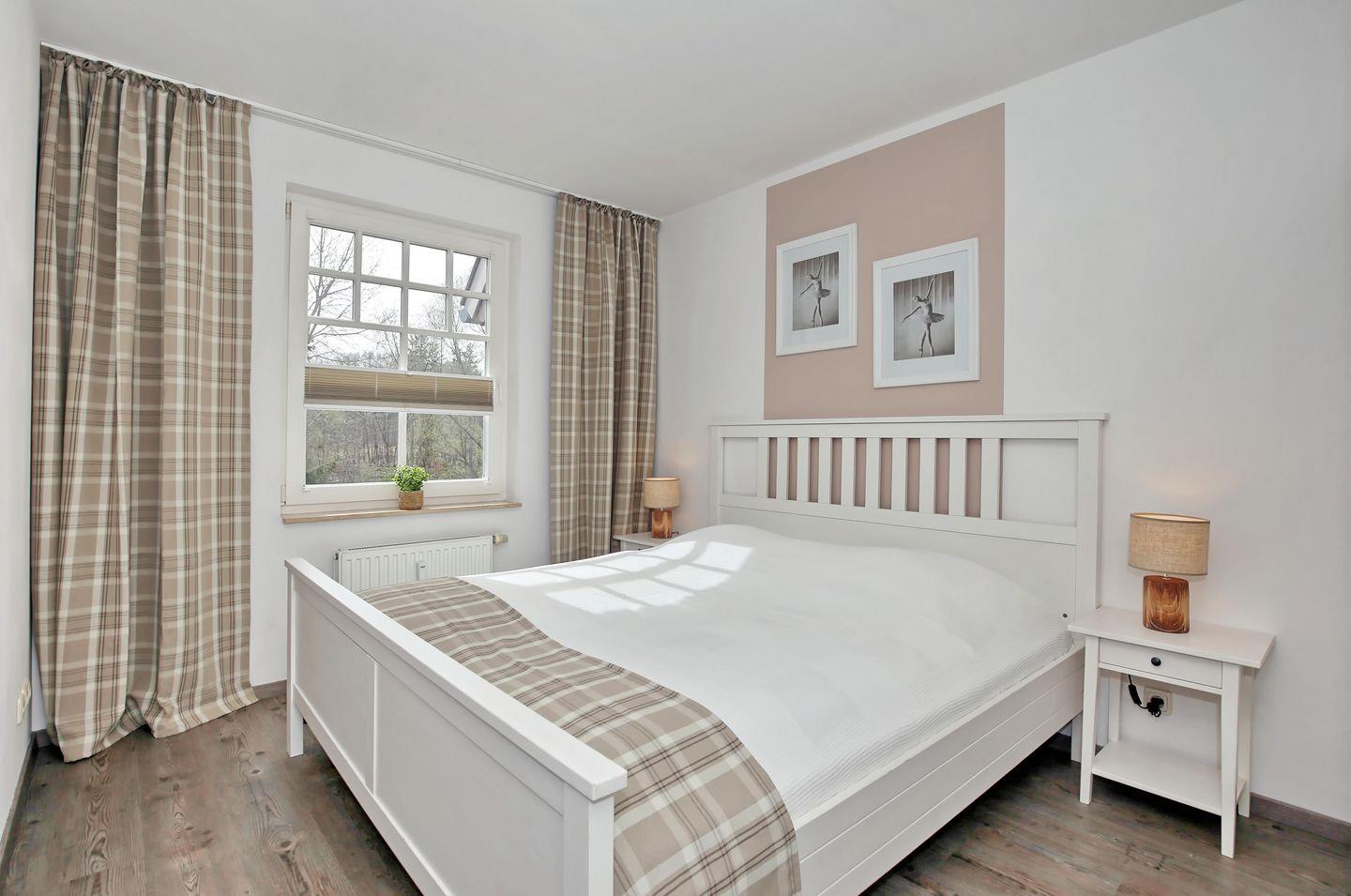 Das Schlafzimmer, welches ebenfalls zur ruhigen Waldseite liegt, bietet dir ein Doppelbett (2 x 90 x 200 cm) für erholsamen Schlaf. Ein 3-türiger Kleiderschrank verfügt über ausreichend Stauraum. Vorhänge und Plissees dienen dir als Sichtschutz oder zum Verdunkeln.