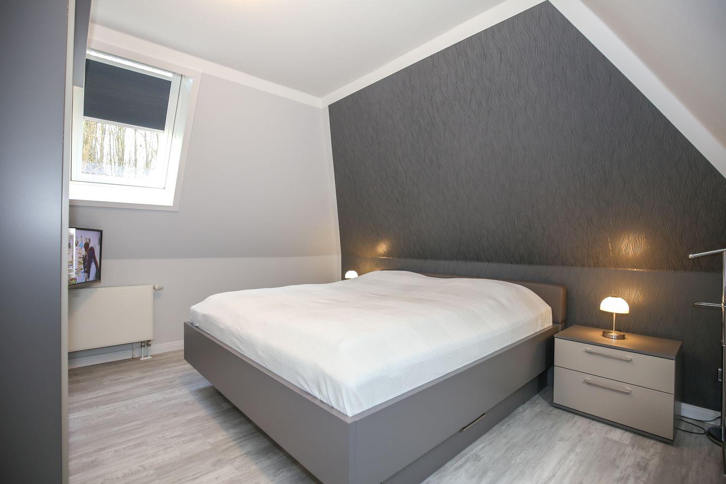 Im Schlafzimmer der Ferienwohnung stehen ein gemütliches Doppelbett, ein Kleiderschrank, ein Schreibtisch sowie ein zweiter TV für dich bereit. Die 3. Person kann bequem auf dem Schlafsofa (140 x 200 cm) übernachten. Dieses findest du auf dem Vorflur des 1. Schlafzimmers. Zur Verdunklung wurden an den Fenstern Rollos angebracht.