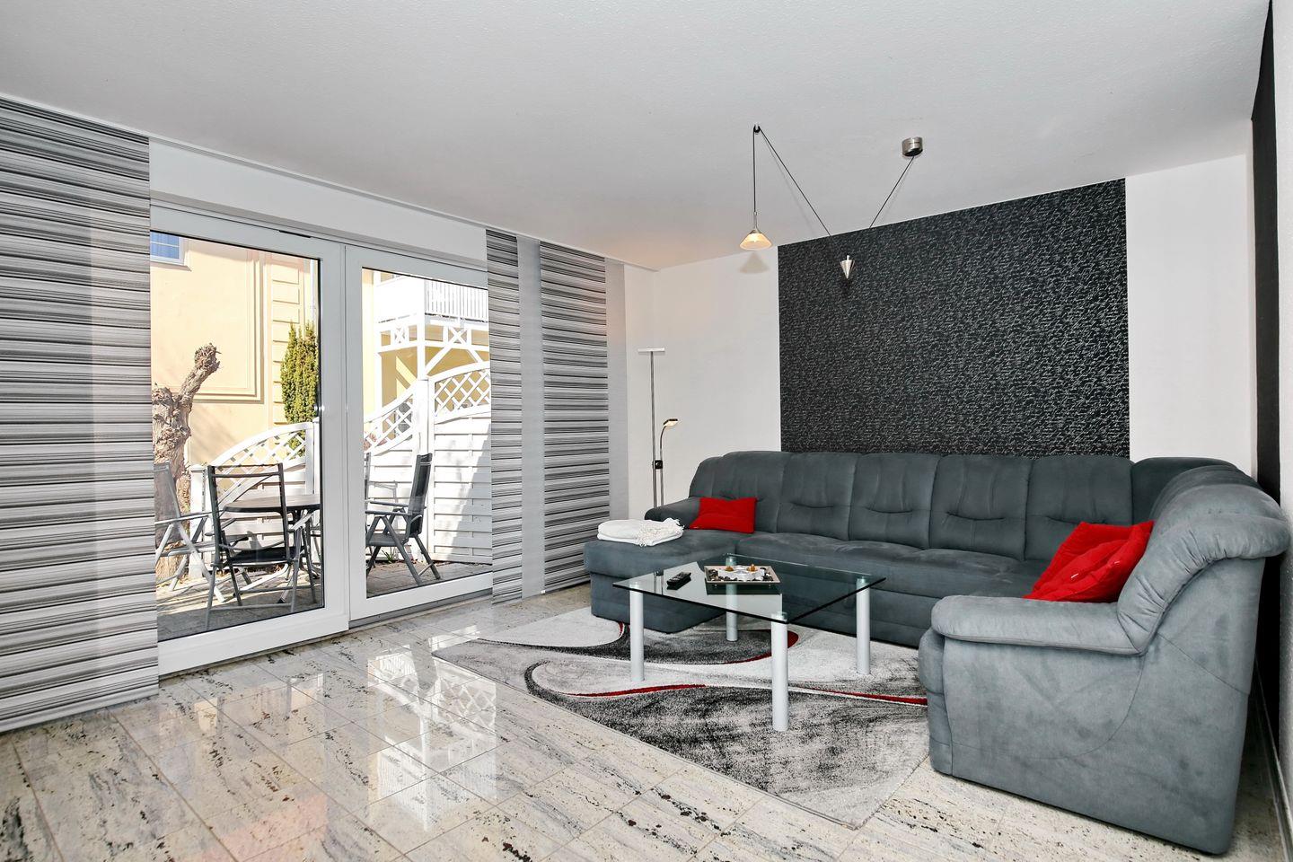 Entspanne auf der großzügigen Sofalandschaft im Wohnbereich. Für Unterhaltung sorgen hier der Flachbild-TV, die Stereo-Anlage und das WLAN (ohne Gewähr). Die Terrasse befindet sich auf der Süd-West-Seite des Hauses und ist vom Wohnzimmer aus zugänglich.