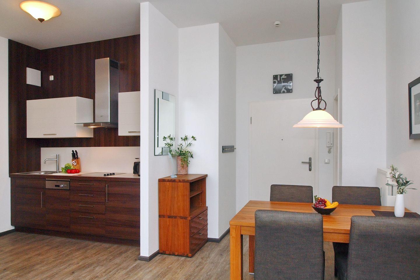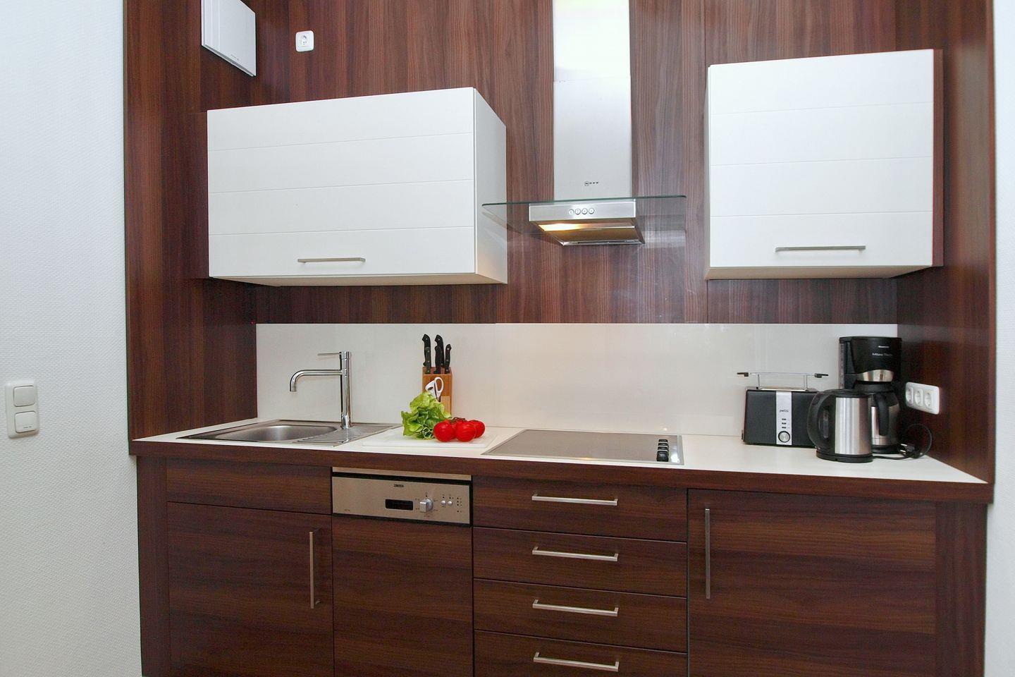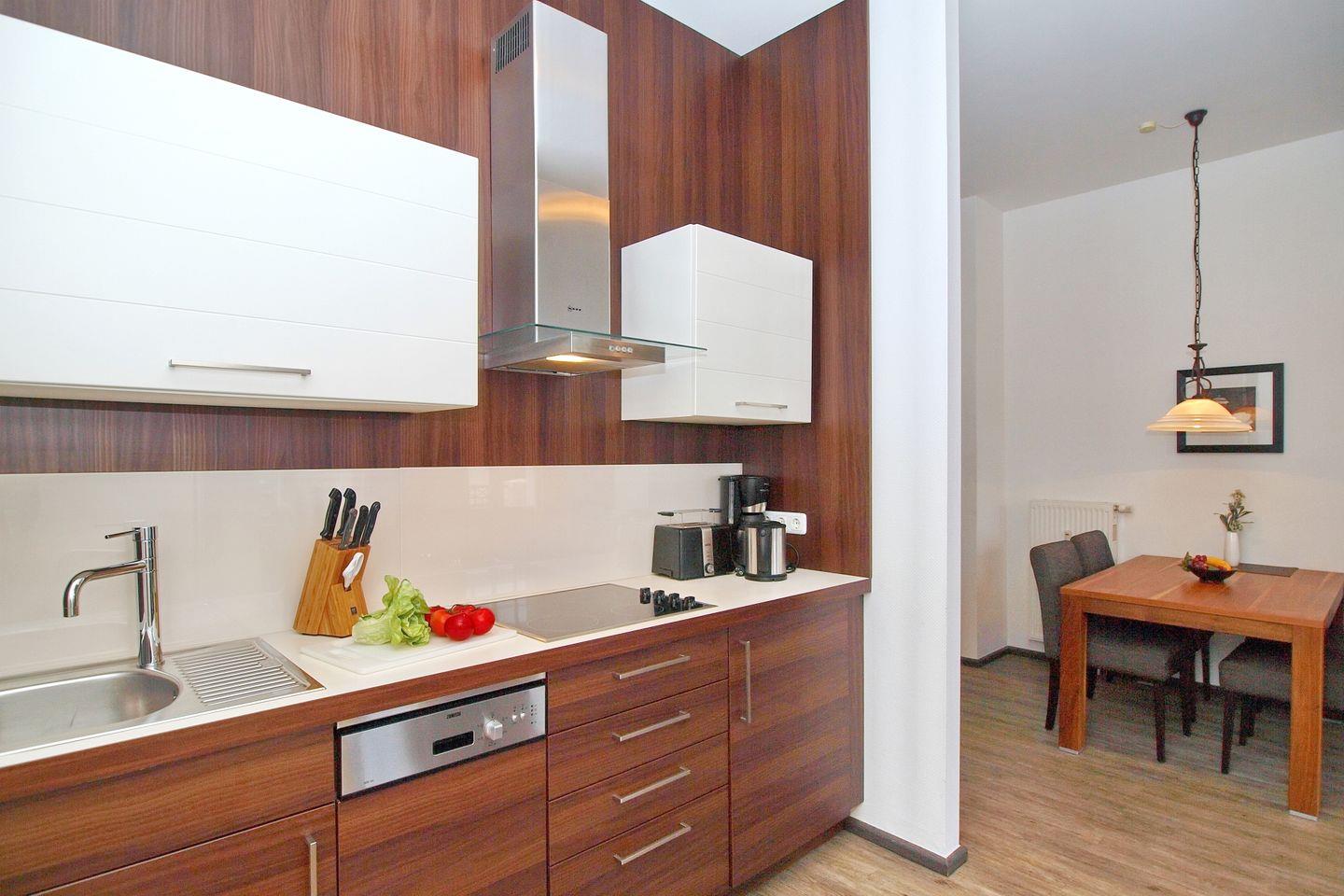 Die moderne Küchenzeile beinhaltet 4-Ceran-Kochfelder, einen Kühlschrank mit Gefrierfach, einen Geschirrspüler, eine Mikrowelle, einen Wasserkocher, einen Toaster und eine Kaffeemaschine.