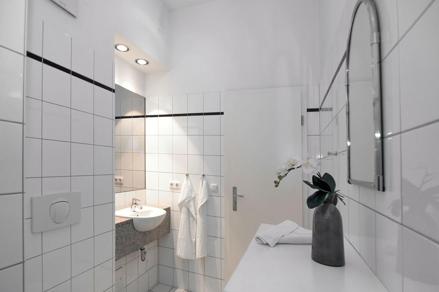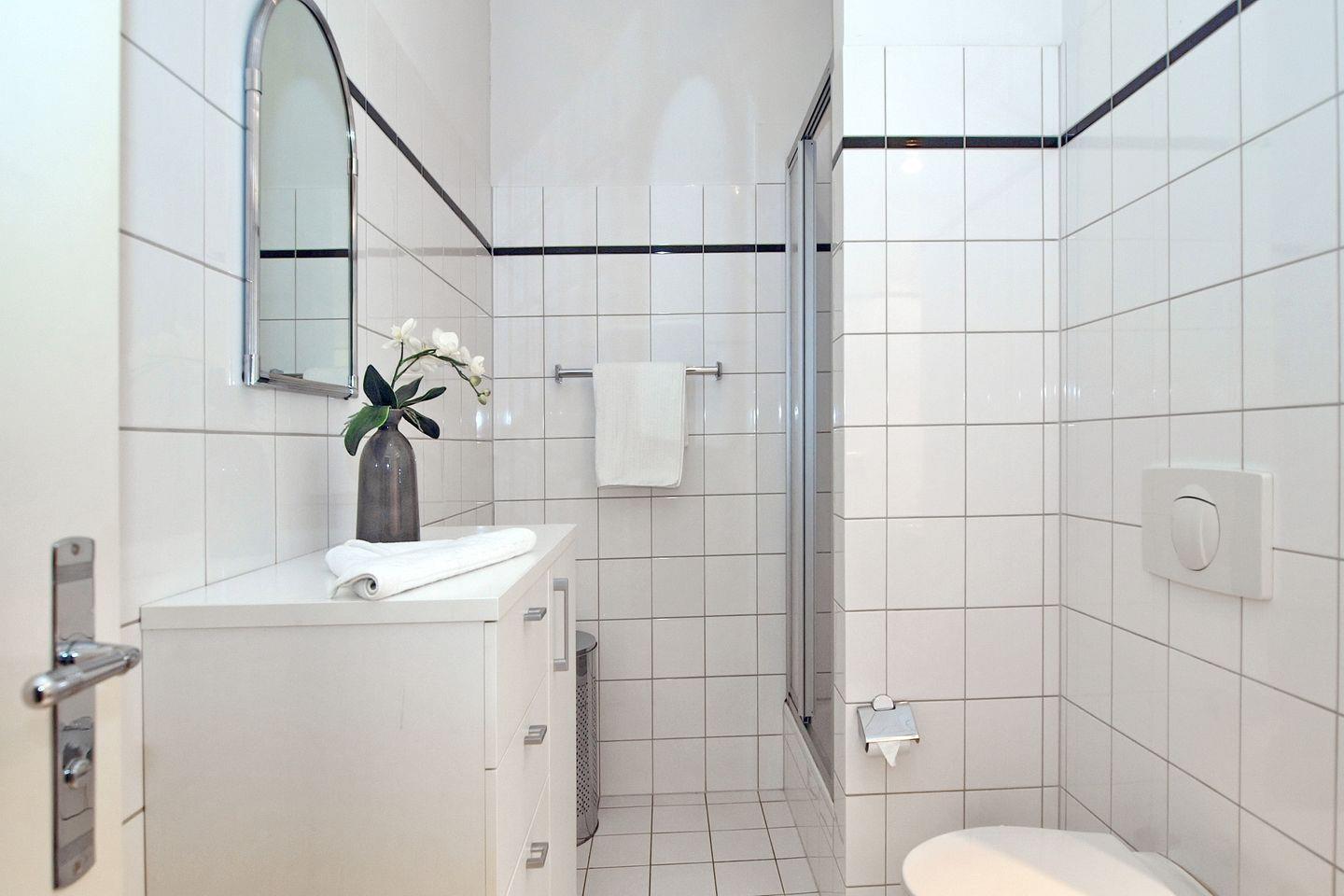 Die moderne Shower-Dusche ist das Highlight des Badezimmers. Eine Kommode bietet im Bad genügend Stauraum für deine Utensilien.