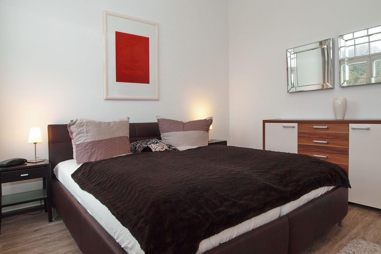 Im Schlafzimmer sorgen ein Sideboard sowie ein großer Kleiderschrank für genügend Stauraum. Ein LCD-Fernseher ist hier ebenfalls vorhanden. Vorhänge dienen als Verdunkelungsmöglichkeit.