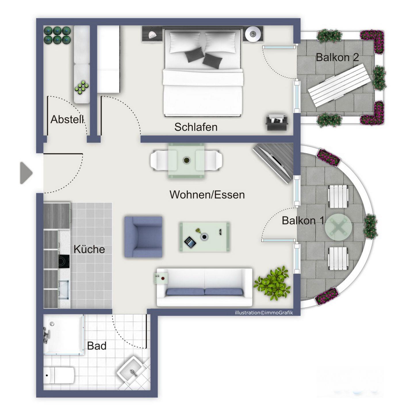 Im Wohnbereich und Duschbad wurden Fliesen verlegt, im Schlafzimmer Vinylboden in Eiche-Optik. Es handelt sich um eine Nichtraucherwohnung, Haustiere sind nicht erlaubt.