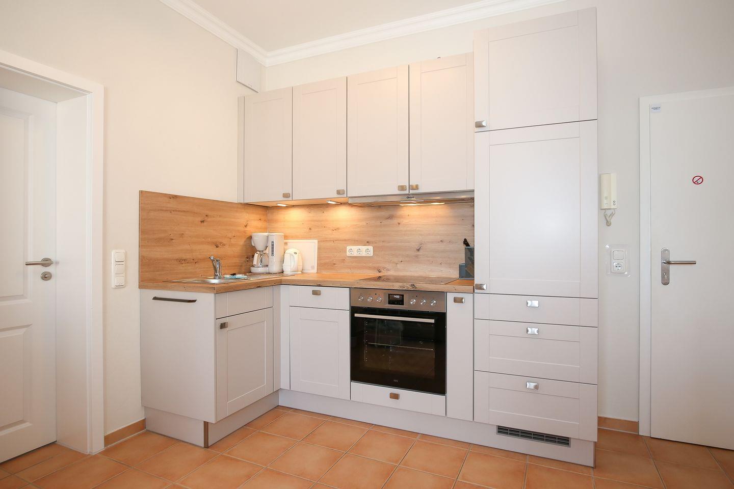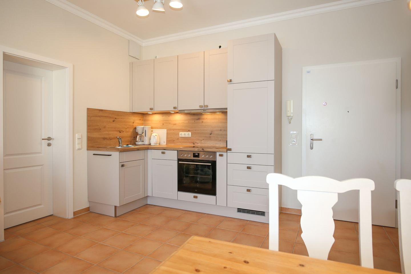 Die im Wohnzimmer integrierte Küchenzeile wurde im November 2025 komplett erneuert und mit einem Kühlschrank/Gefrierfach, 4 Cerankochfeldern, einem Backofen und Geschirrspüler sehr gut ausgestattet. Ebenso stehen Ihnen eine Kaffeemaschine, Kapselmaschine CoffeeB (Kapseln im Edeka-Markt erhältlich), Wasserkocher und Toaster zur Verfügung. Der Essbereich befindet sich im Wohnbereich.