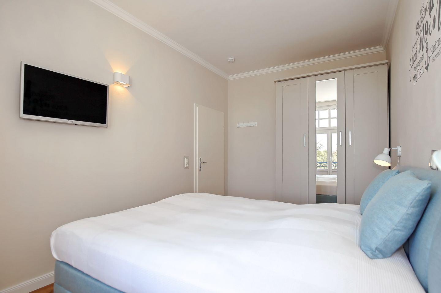 Im ebenfalls renovierten und neu eingerichteten Schlafzimmer befindet sich ein komfortables Boxspringbett (1,80 x 2,00 m), ein zweiter Flachbild-TV und ein dreitüriger Kleiderschrank für deine Urlaubskleidung. Vorhänge dienen zum Verdunkeln. Von hier ist der zweite Balkon zu begehen.