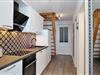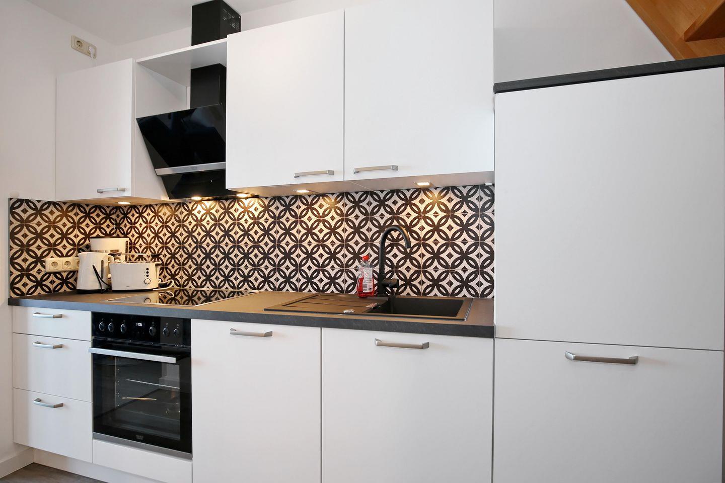 Der Wohnbereich ist mit einer Couch, zwei Sesseln und einem Flachbild-TV ausgestattet. Der Essbereich ist hier integriert. Die Küchenzeile beinhaltet ein 4-Platten-Cerankochfeld, einen Geschirrspüler, einen Wasserkocher, eine Kaffeemaschine, einen Toaster sowie einen großzügigen Kühlschrank mit Gefrierfach.