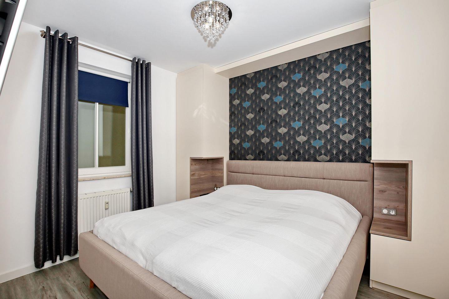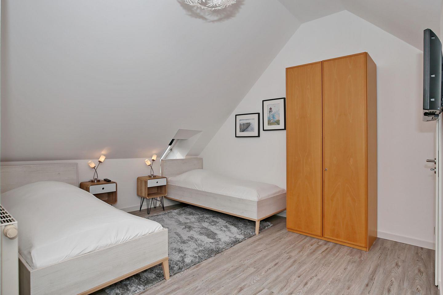 Im unteren Schlafzimmer befinden sich ein bequemes Doppelbett (2 x 90 x 200 cm), ein Einbaukleiderschrank und ein TV. Das Schlafzimmer ist Richtung Atrium gelegen. Im Obergeschoss befindet sich das zweite Schlafzimmer. Es ist mit zwei Einzelbetten (2 x 90 x 200 cm), einem Nachtschrank, einem Kleiderschrank, einem Sessel sowie einem TV eingerichtet.