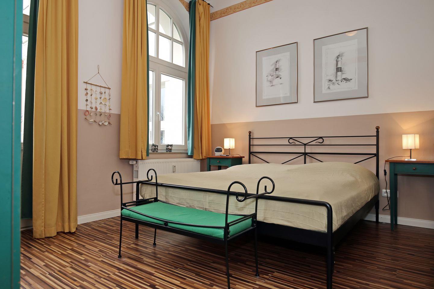 Im Schlafzimmer findest du ein Doppelbett mit einer Liegefläche von 2 x 90 x 200 cm, einen Kleiderschrank, eine Wäschekommode, zwei Nachttische und ein Flachbild-TV. Im Eingangsbereich steht dir eine Garderobe zur Verfügung. Zur Verdunklung kannst du die Vorhänge nutzen.