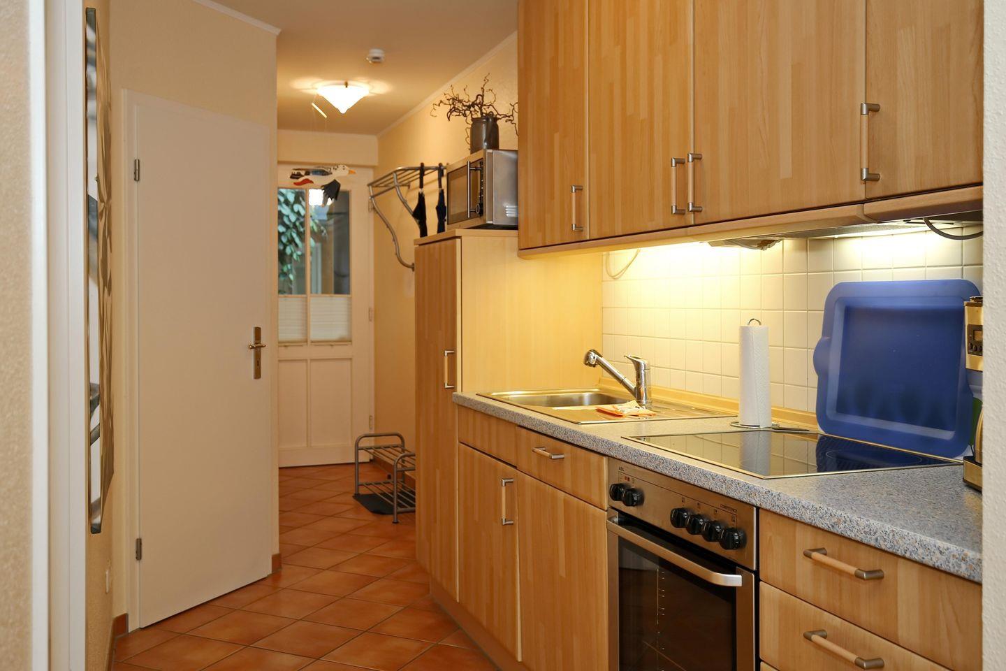 Die angrenzende Küchenzeile ist mit einem Kühlschrank mit Gefrierfach, einem Geschirrspüler, einem 4-Platten-Cerankochfeld, Backofen und einer Mikrowelle voll ausgestattet. Natürlich stehen dir ein Toaster, eine Kaffeemaschine und ein Wasserkocher zur Verfügung.
