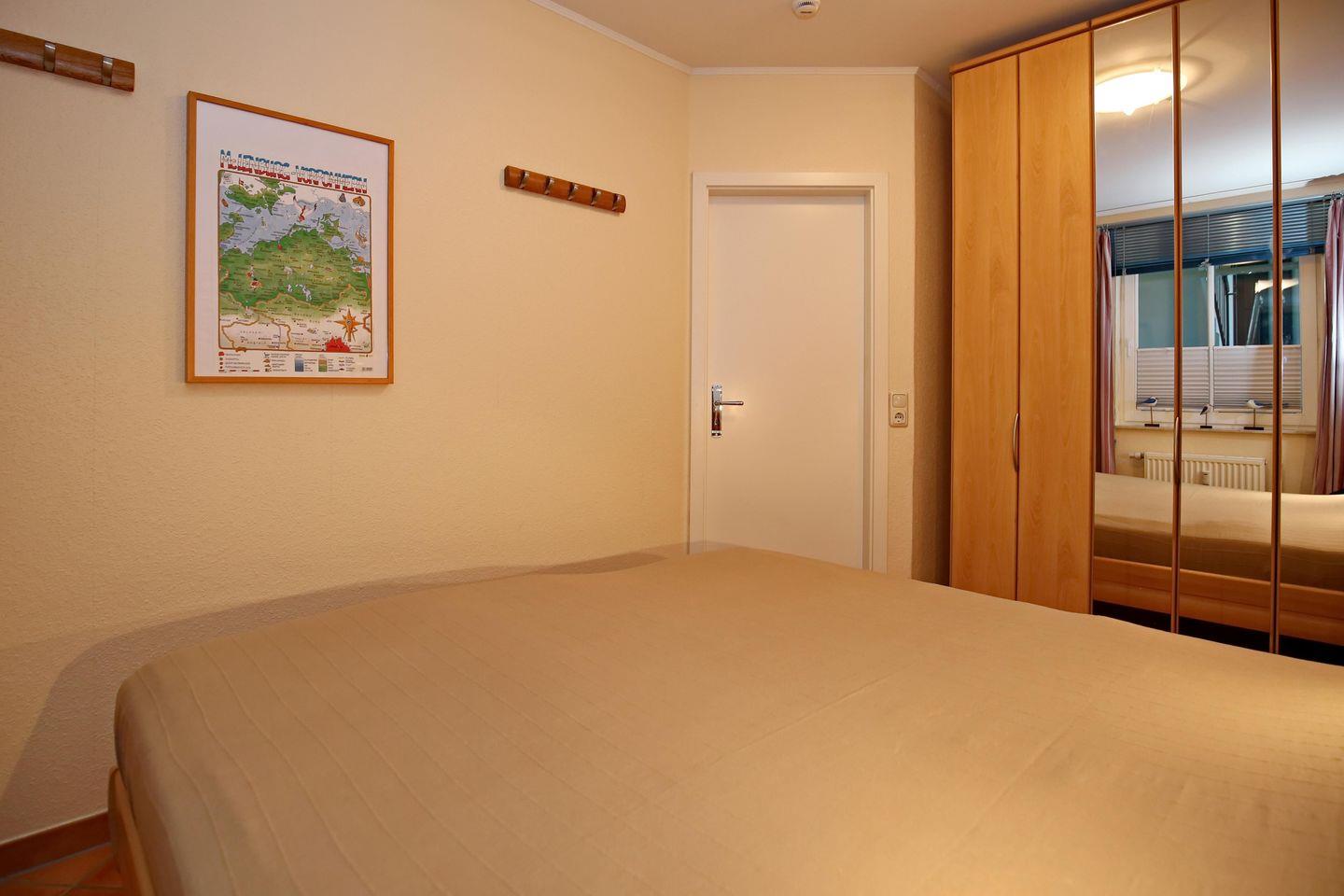 Im Schlafzimmer dieser Ferienwohnung lädt dich ein Doppelbett (2 x 90 x 200 cm) zum erholsamen Schlaf ein. Ein großer Spiegelkleiderschrank bietet sehr viel Stauraum. Ein Plissee und Vorhänge dienen zum Verdunkeln (das Schlafzimmerfenster geht zum Atrium raus).