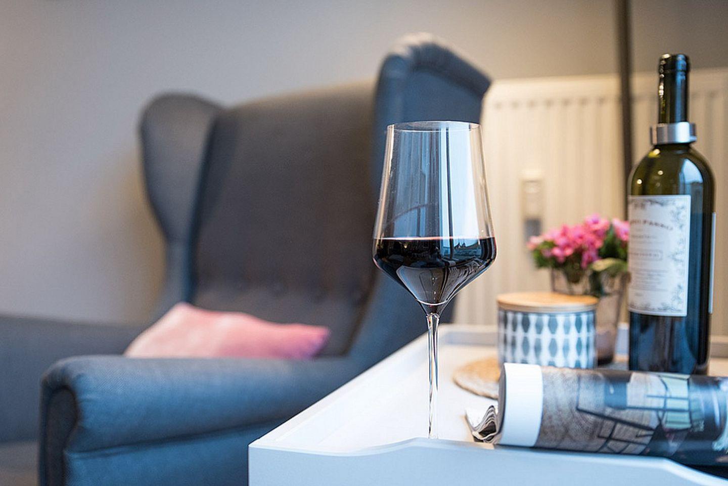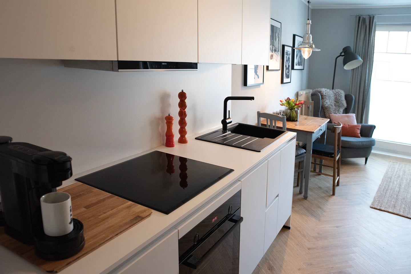 Die angrenzende offene Küchenzeile mit Essbereich ist mit einem Kühlschrank mit Gefrierfach, einem Geschirrspüler, einem 4-Platten-Induktionskochfeld und einem Backofen voll ausgestattet. Natürlich stehen dir ein Toaster, eine Kaffeemaschine (für Filterkaffee und Senseo-Pads), ein Eierkocher sowie ein Wasserkocher zur Verfügung.